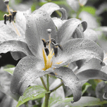 I took this photograph using a creative filter on a rainy summer's morning. Features a close-up of a Lily flower revealing dewdrops delicately a...[+]