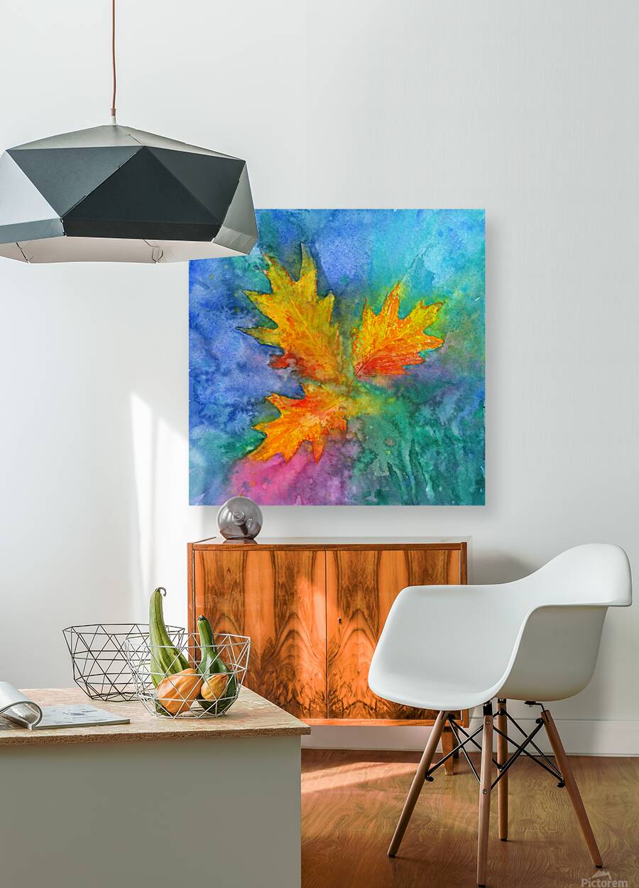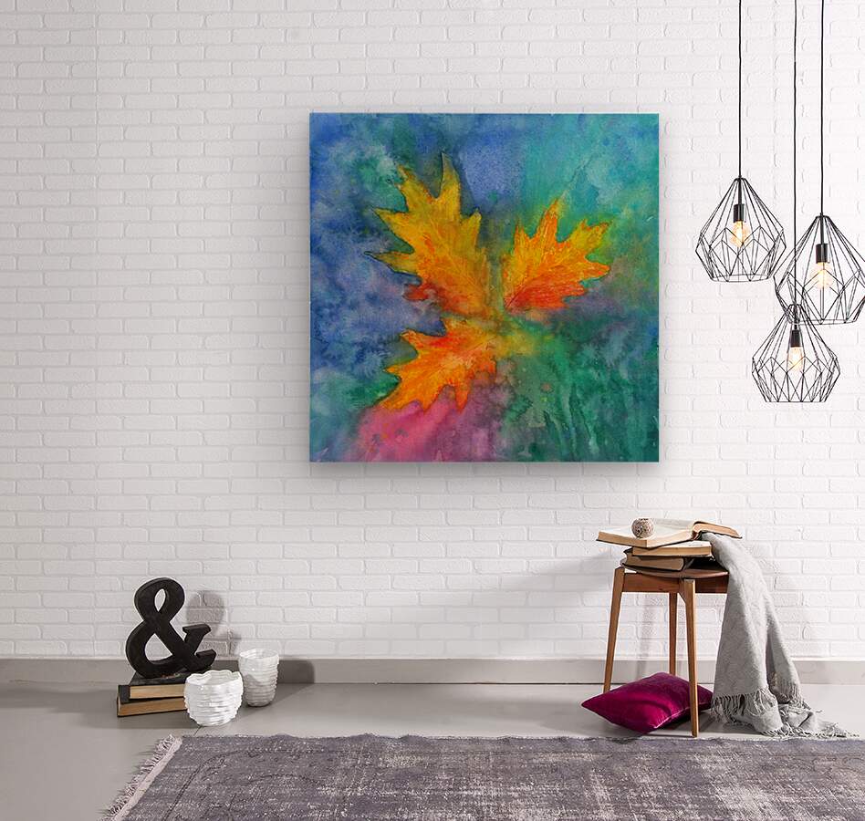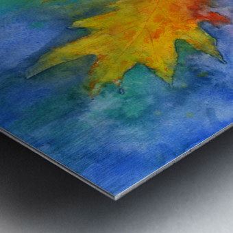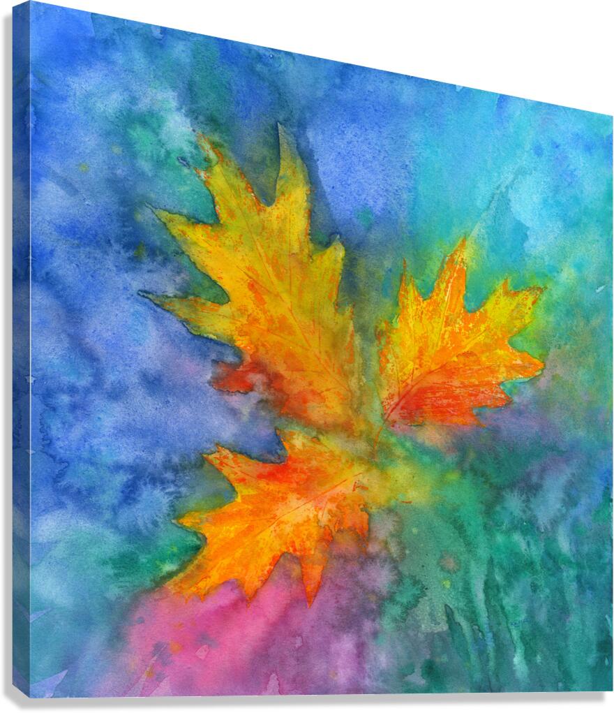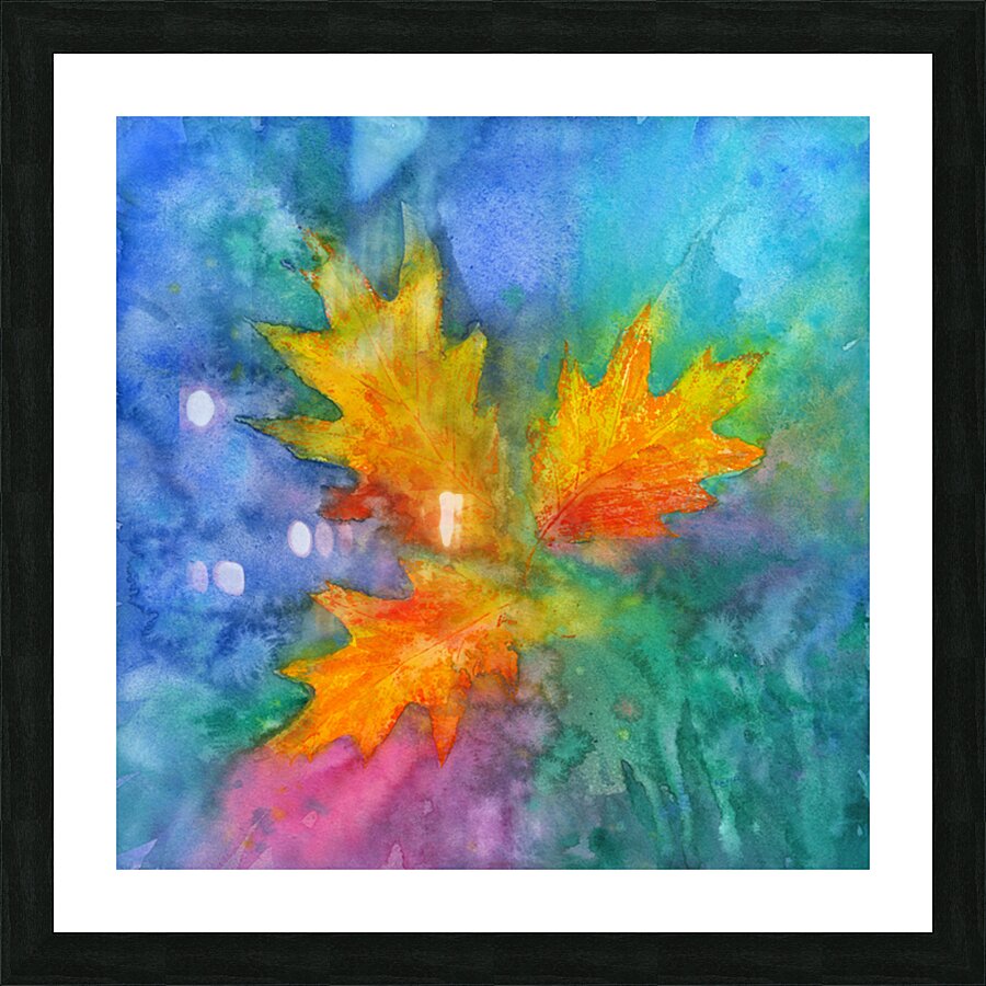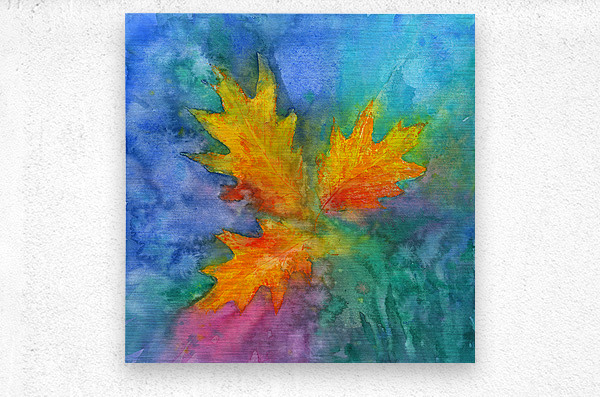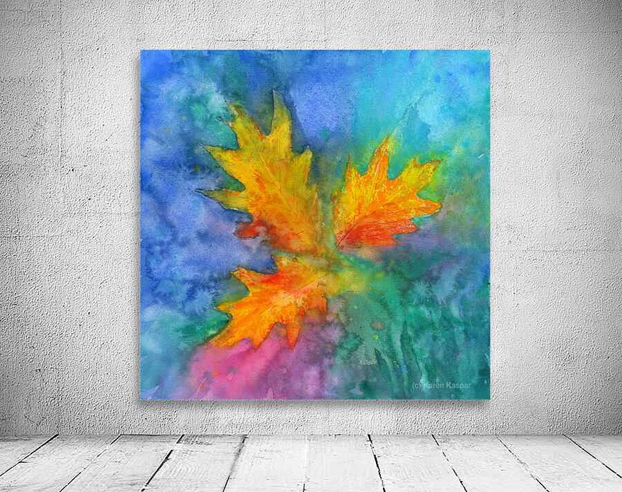 Three Oak Leaves is a painting in contemporary square format in which the artist Karen Kaspar used both watercolors and acrylics. Three leaves of the Red Oak or Northern Red Oak Quercus rubra in bright warm autumn colors of yellow orange and red float on an abstract background in various shades of blue blue-green turquoise purple and pink. A firework of autumn colors! Fine art prints and home decor from original artwork paintings and photography by artist Karen Kaspar. 499