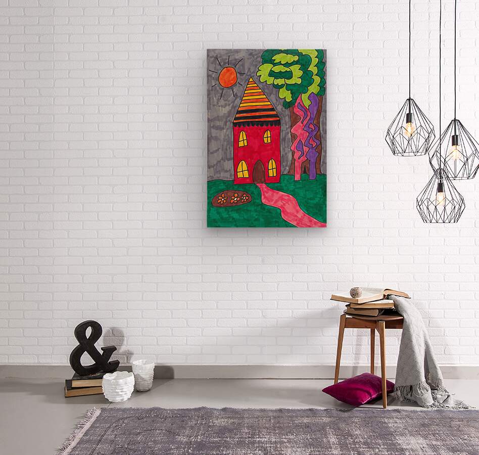 Once a hand drawn abstract created from imagination using coloured ink pens and paper. A colourful drawing depicting a red house with a striped roof next to a large green tree and a peculiarly shaped purple tree. A sun hangs in the sky, and a winding path leads up to the house, with a small flowerbed nearby. Excluding Wall Art, you can customise this design by choosing your favourite available background colour, to really make it your own.