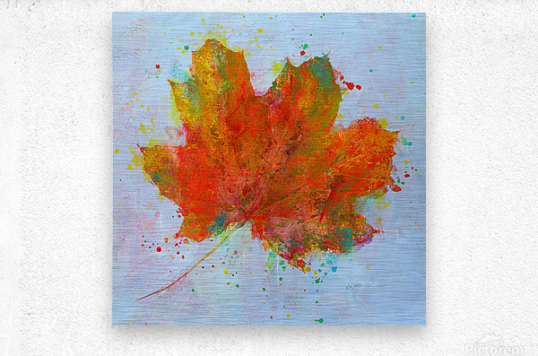 Single Maple Leaf in fall is an acrylic painting in contemporary square format, hand-painted by artist Karen Kaspar. A single leaf of a maple tree in vibrant warm autumn colours of yellow, orange, red and green floats on an abstract light blue background, surrounded by loose splashes of colour that echo the autumnal colours of the leaf. The use of colour and texture gives the leaf a dynamic, almost three-dimensional effect. The luminous warm colours of the autumn leaves are emphasised in their luminosity and vibrancy by the background in contrasting light cool blue tones. Fine art prints and home decor from original artwork, paintings and photography by artist Karen Kaspar. 329