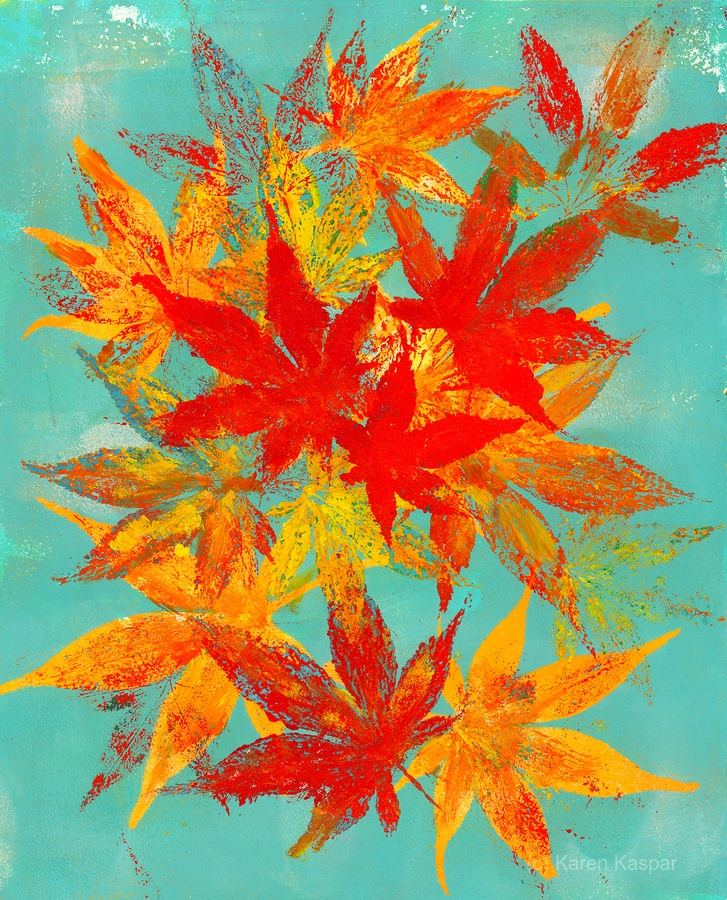 Red Japanese Maple leaves on blue is an acrylic painting in portrait format painted by artist Karen Kaspar. Maple leaves in bright shades of orange and red dance across an abstract blue background. While watering the flowers of my neighbour today, I had the opportunity to shoot some reference photos of her beautiful Japanese Maple trees for future paintings. Although the leaves in nature are still green, I was in the mood for some warm yellow, orange and red fall colors. A teal blue background enhances the contrasting warm colors of the leaves. I see the blue sky behind the acer leaves, but when I showed the finished painting to my hubby, he said he sees the leaves floating on aqua blue water in a pond or pool. What do you see? Fine art prints and home decor from original artwork, paintings and photography by artist Karen Kaspar. 320