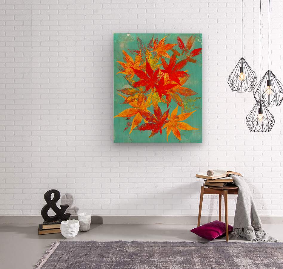 Red Japanese Maple leaves on blue acrylic painting  Wood print