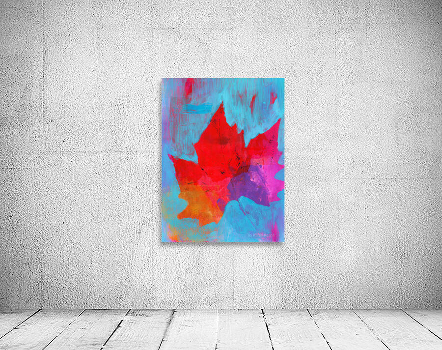 Big colorful leaf is an acrylic painting in portrait format painted by the artist Karen Kaspar. A single large leaf of a Plane tree is blown across the sky by the autumn wind. The background is painted abstractly in light blue tones. The foliage glows in strong warm fall colors of gold orange red pink and purple. The colors of the foliage keep shimmering through the blue of the sky in the background. The leaves of a Plane tree are similar in shape to the leaves of the Maple tree but can be significantly larger. The Plane tree is also known as Platanus or Sycamore tree. Fine art prints and home decor from original artwork paintings and photography by artist Karen Kaspar. 482
