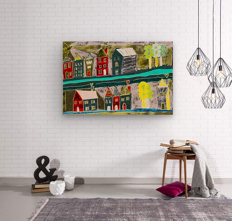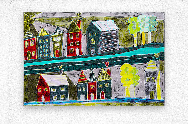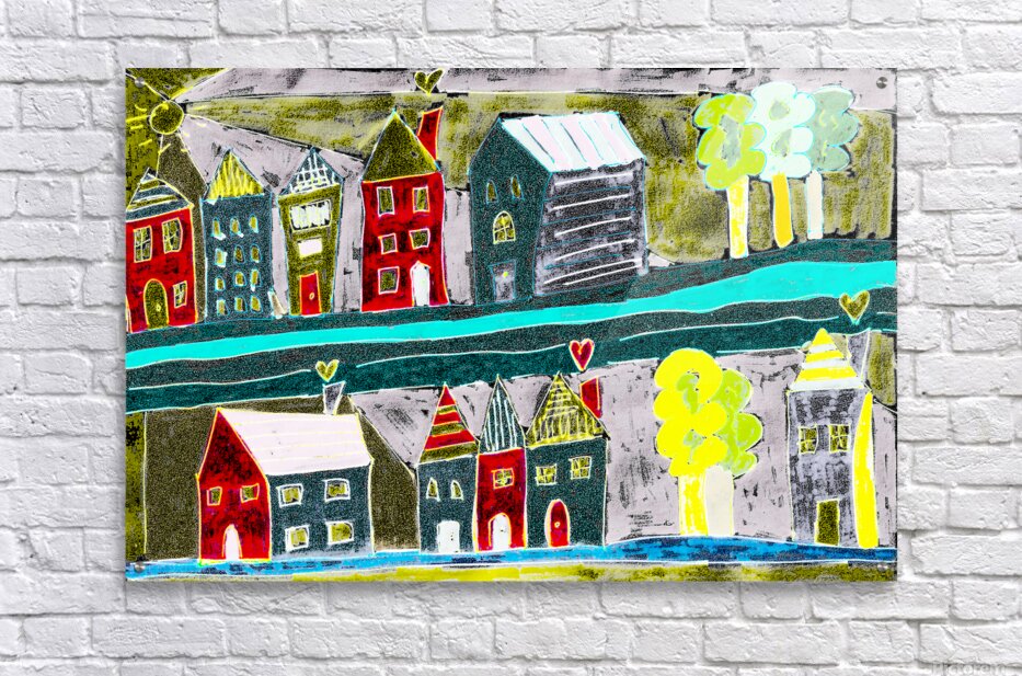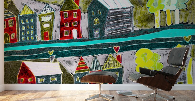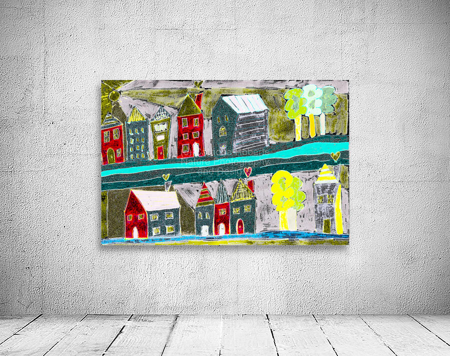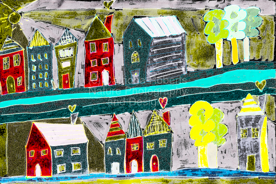 I hand drew this design using coloured ink pens and paper, laterally digitally colour editing this to create a stunning piece of abstract art. Features colorful rows of quaint houses positioned along a bright blue river, with whimsical trees accenting the landscape. Geometric shapes and vibrant colors create a playful and lively depiction of a village scene.