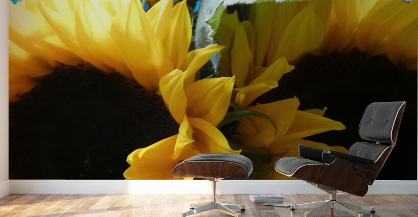 I took a close up photo of Sunflowers and superimposed them onto a hand painted acrylic abstract design I painted ( using the Magic AI Background Remover and layering options in canva.com) creating this stunning piece of contemporary floral art. Features bright yellow sunflowers which dominate the scene, their petals unfurled around deep brown centers. A vibrant blue background contrasts with the lush green leaves, enhancing the composition.
