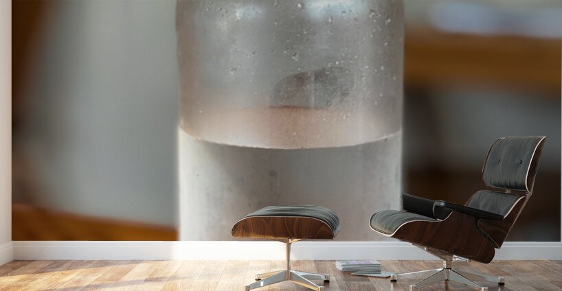 A frosted glass bottle, looking like it just came from a fancy spa, lounges on a wooden table. It's only partially filled with water, probably bec...[+]