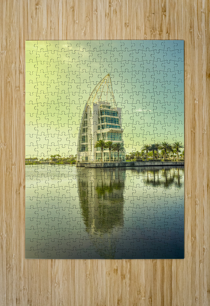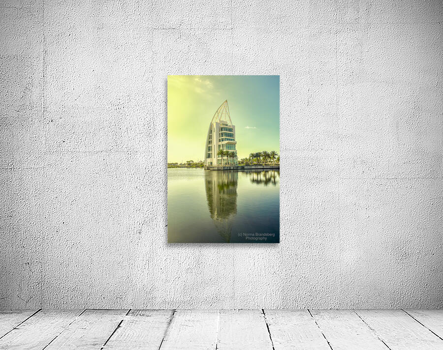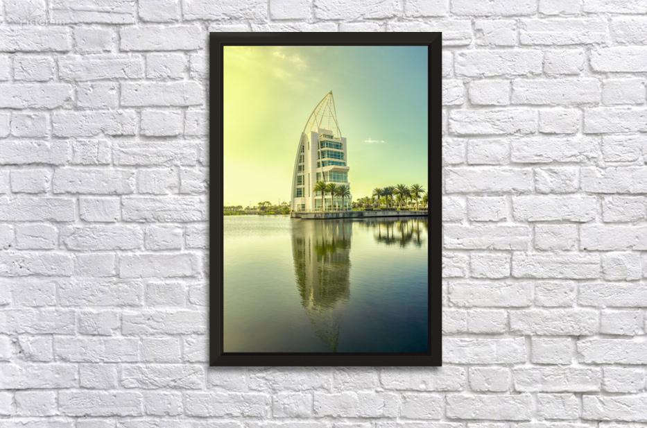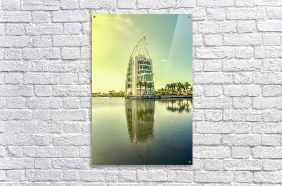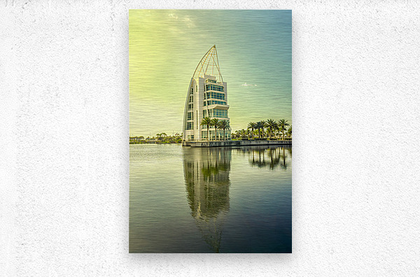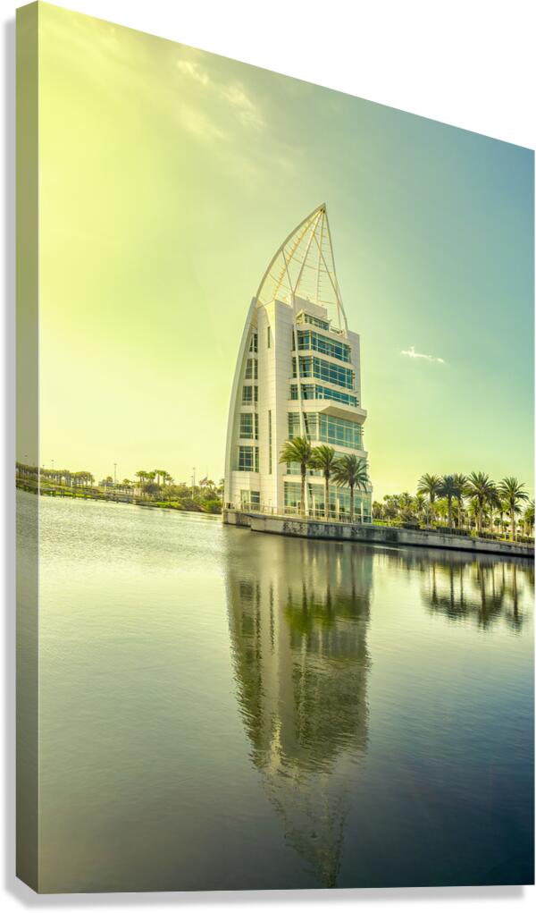 Port Canaveral Exploration Tower Museum viewed in a day reflection pond below in colors of blue, yellow and green in a vertical format. Built in a modern futuristic, abstract design concept, the unique curved architecture is reflected in the calm lake waters. It is a favorite place to view Cape Canaveral Port launches in the area. The clear sky and palm trees add to the serene backdrop, enhancing the pastel architectural beauty of the structure.