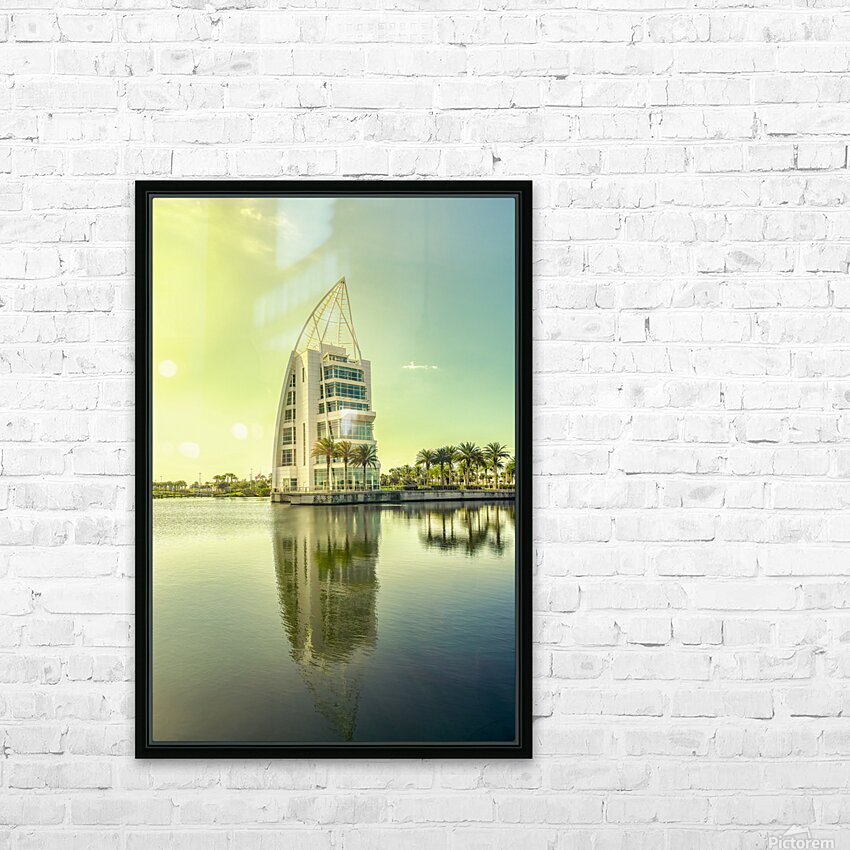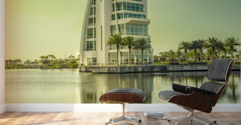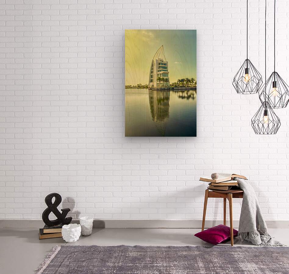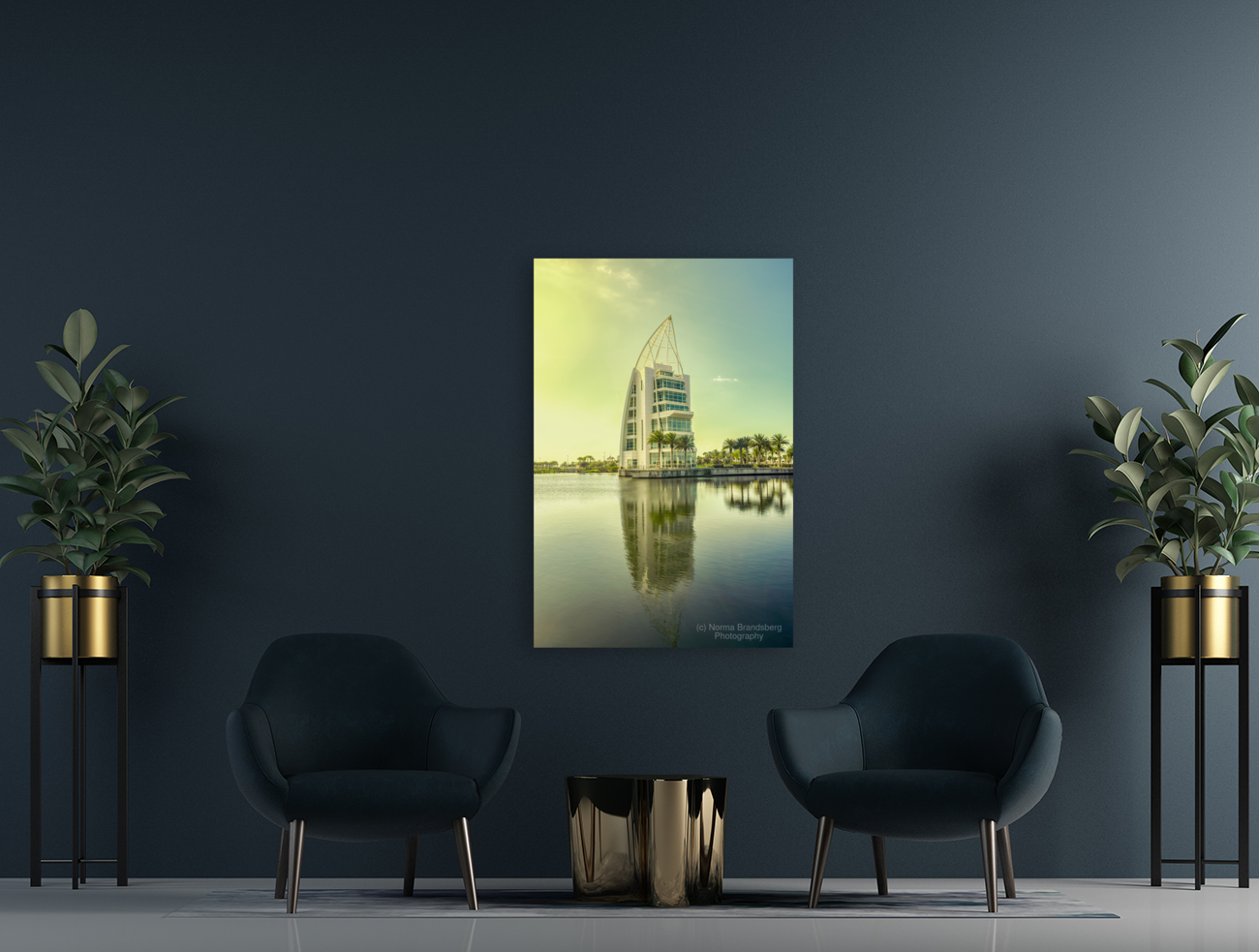 Port Canaveral Exploration Tower Museum viewed in a day reflection pond below in colors of blue, yellow and green in a vertical format. Built in a modern futuristic, abstract design concept, the unique curved architecture is reflected in the calm lake waters. It is a favorite place to view Cape Canaveral Port launches in the area. The clear sky and palm trees add to the serene backdrop, enhancing the pastel architectural beauty of the structure.