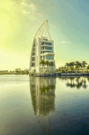 Port Canaveral Exploration Tower Museum viewed in a day reflection pond below in colors of blue, yellow and green in a vertical format. Built in a mo...[+]