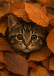 This enchanting photograph captures an adorable tabby kitten nestled among a blanket of vibrant autumn forest leaves. The kitten’s wide, curious eye...[+]