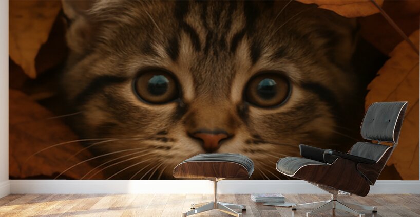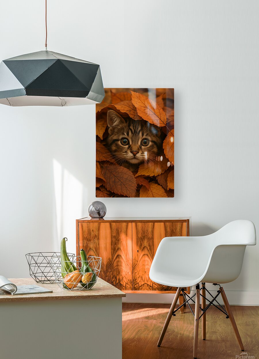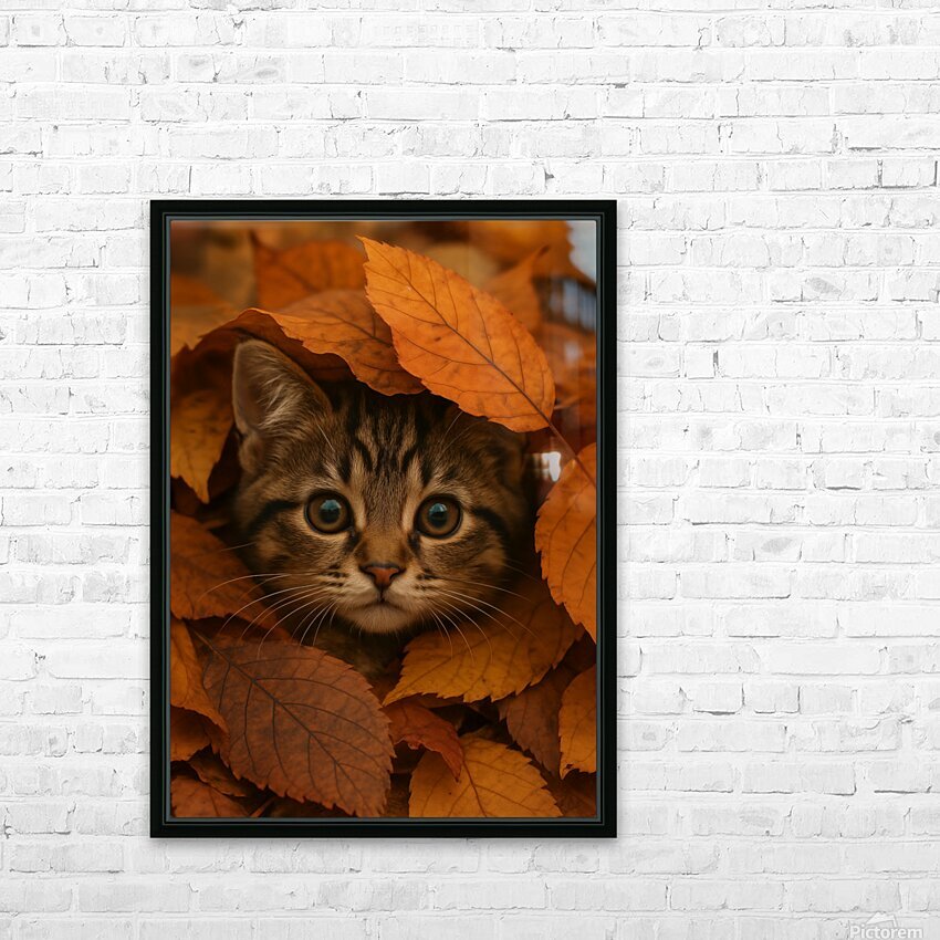 This enchanting photograph captures an adorable tabby kitten nestled among a blanket of vibrant autumn forest leaves. The kitten’s wide, curious eyes peek out from beneath layers of golden, orange, and rust-colored foliage, evoking a sense of warmth and seasonal charm. Perfect for cat lovers and autumn enthusiasts alike, this cozy fall portrait brings together the beauty of nature and the innocence of a playful kitten. Ideal for rustic home decor, pet lovers’ collections, or seasonal wall art, this image radiates the magic of the forest in autumn.