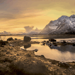 Near the arctic town of Leknes in the southern Lofoten Islands, the Vestfjorden coastal fjord road view reflects the golden hues of a sunset, with a m...[+]