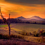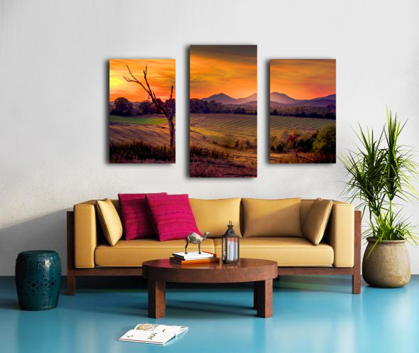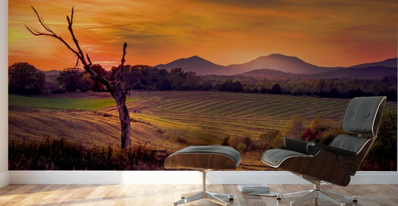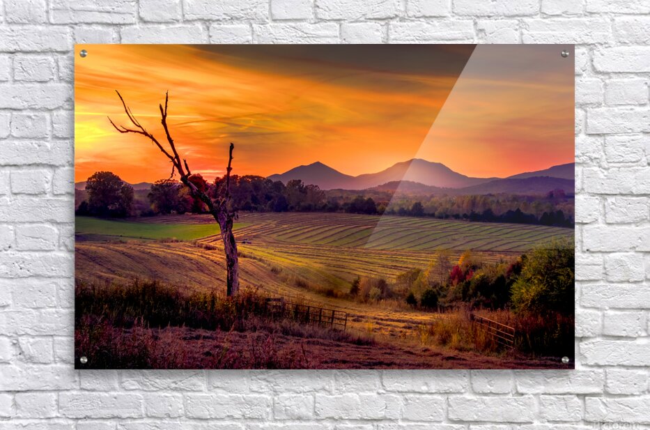 A breathtaking Appalachian Mountains Autumn vista sunset casts a vibrant palette of oranges and purples across the sky, silhouetting a barren tree in the foreground. The structured lines of the agricultural fields and open gate lead the eye toward the majestic mountains in the background, creating a captivating sense of depth. The harmonious blend of nature's elements evokes a feeling of tranquility and awe.