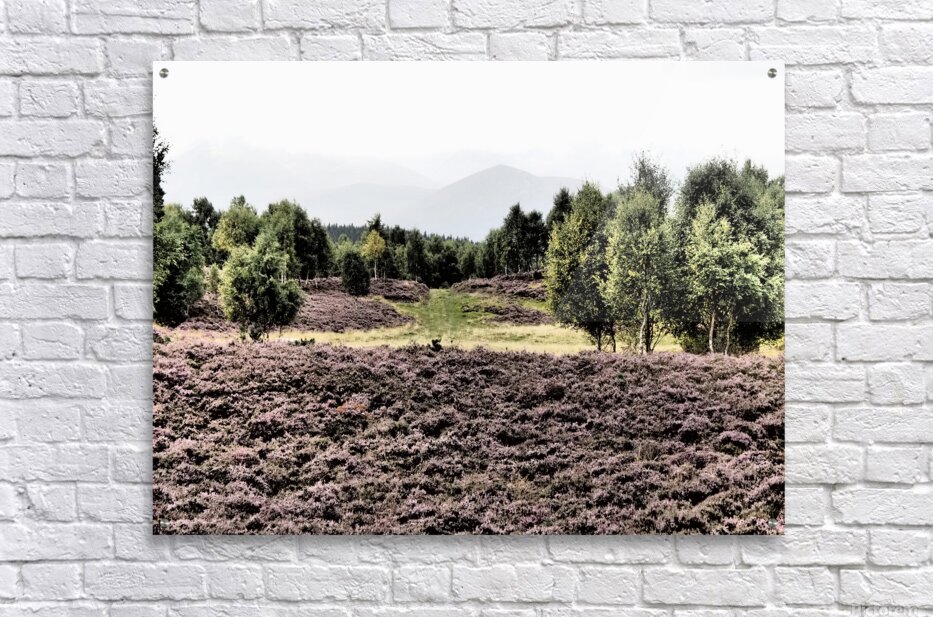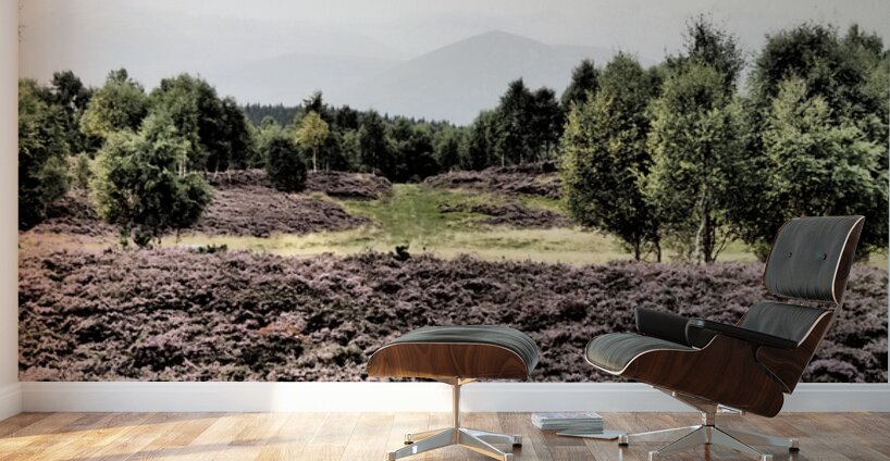 I took this photo during a lovely summer nature walk through the Scottish Highlands. Features a lush expanse of heather stretching across the foreground, adding a mauve hue to the landscape. In the distance, a line of trees stands tall against a backdrop of gentle mountains and a pale sky. The scene evokes a sense of tranquility and natural beauty.