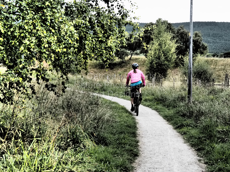I took this photo during a lovely summer nature walk through the Scottish Highlands. Features a person wearing a bright jacket riding a bicycle alon...[+]