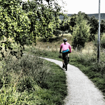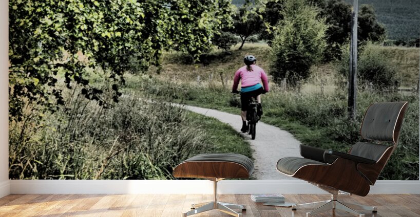 I took this photo during a lovely summer nature walk through the Scottish Highlands. Features a person wearing a bright jacket riding a bicycle along a winding path through lush greenery. The landscape is peaceful, with tall grasses and Birch trees providing a serene natural backdrop. The distant hills add depth to the scene, enhancing the tranquil atmosphere.