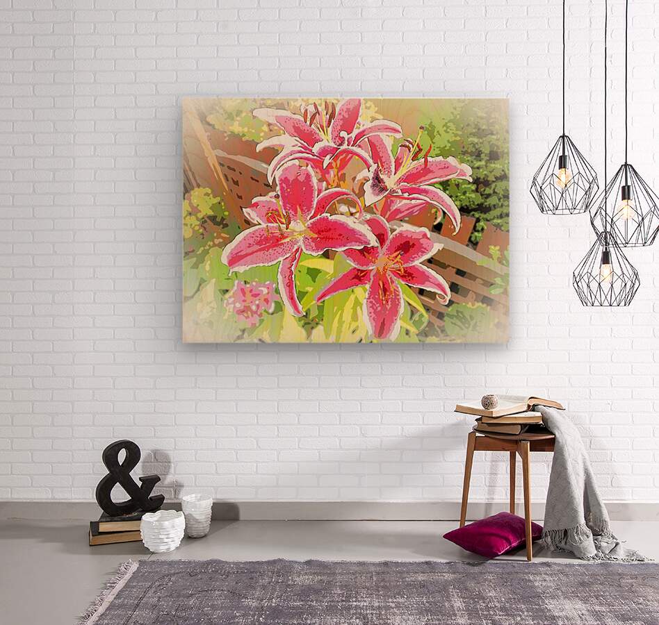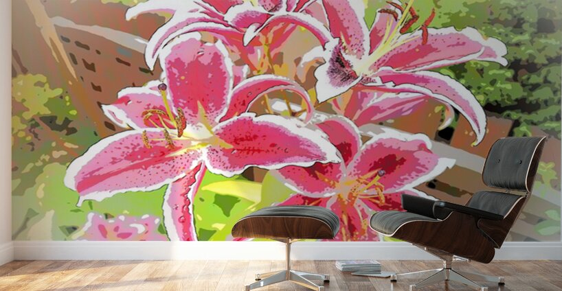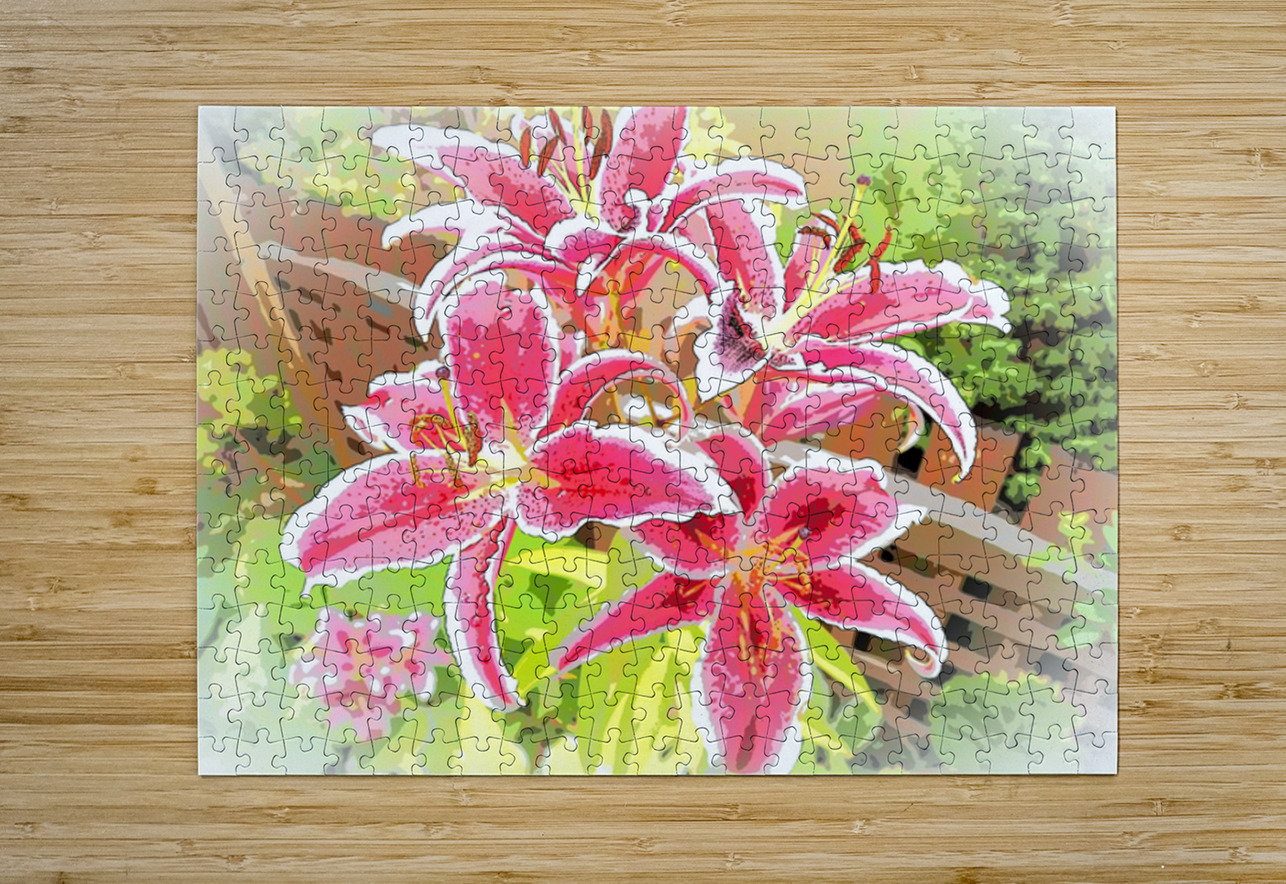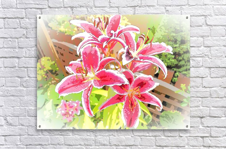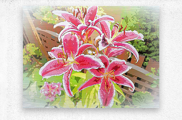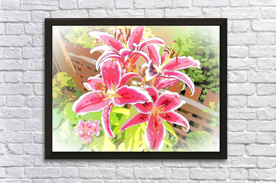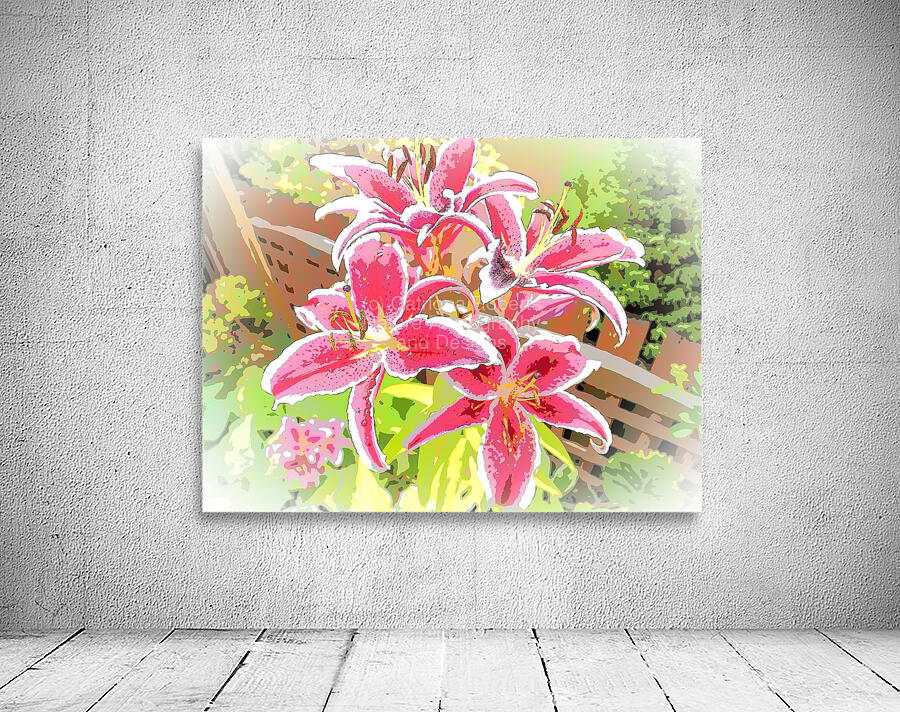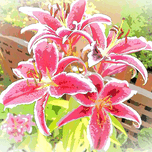 I took this photo during a lovely summer's day using a creative filter. Features a cluster of vibrant pink lilies standing out against a soft, blurred background of greenery and a wooden fence. The petals appear luminous and vivid, giving the flowers an animated and lively presence. The use of bright colors and soft focus creates an uplifting and cheerful scene.