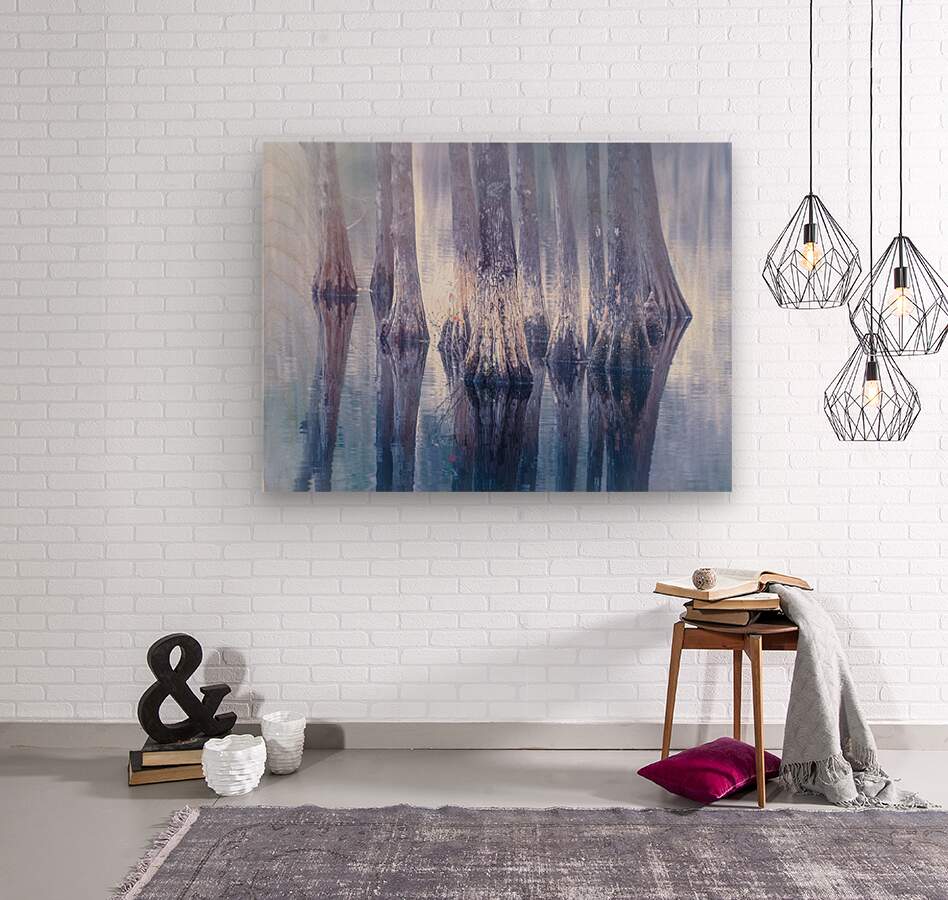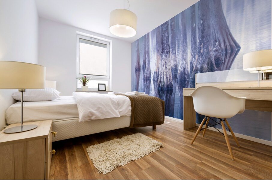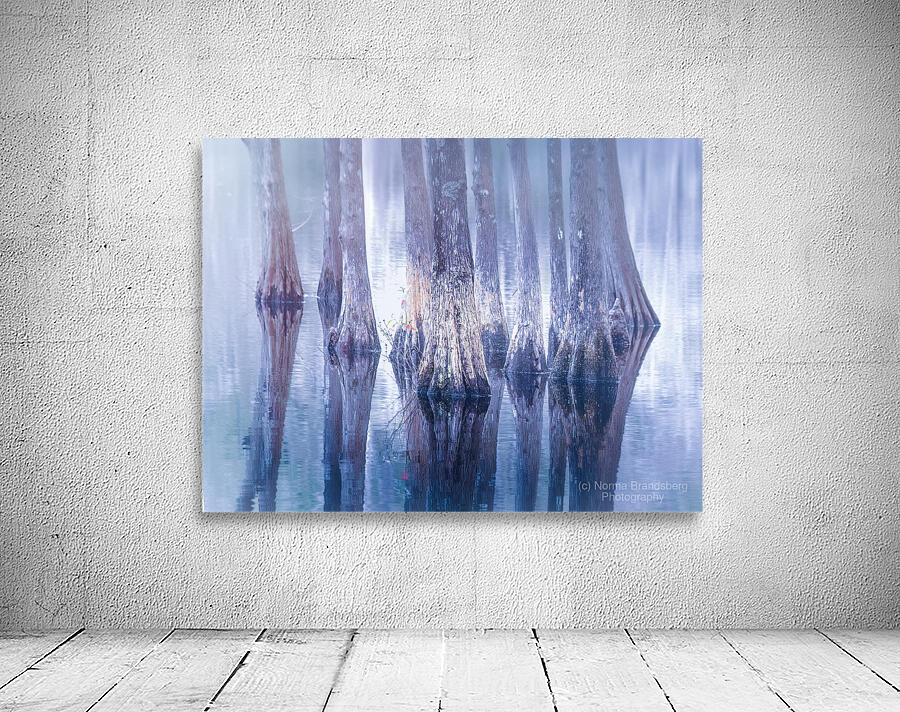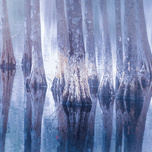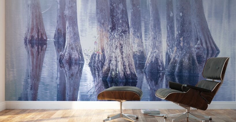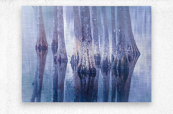 A Bald Cypress Tree forest swamp emerges from a still, winter pond in South Carolina's low country, Located between Charleston and McClellanville near Awendaw the blue-tinted pastel, atmosphere gives the nature preserve an ethereal quality, with the low winter light transforming the serene, dreamlike scene into an minimalistic landscape.