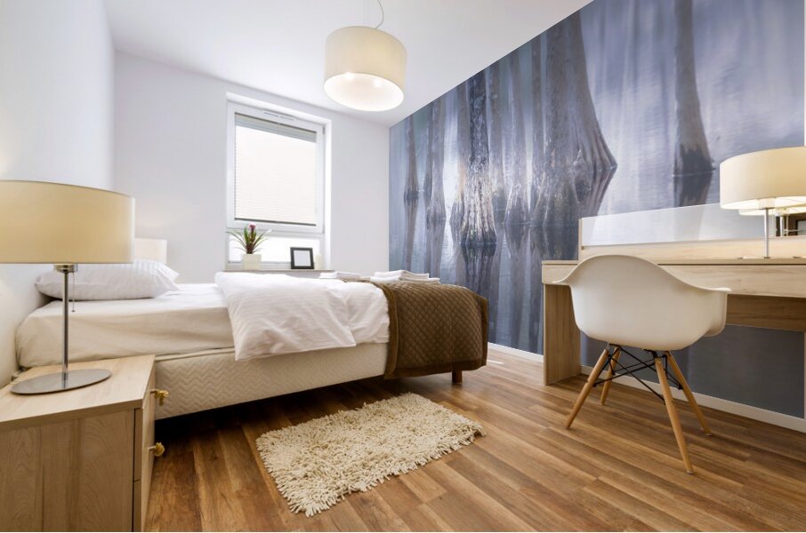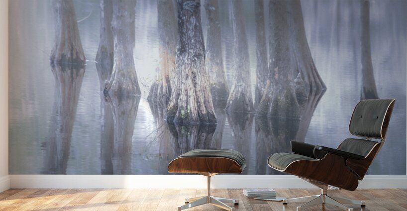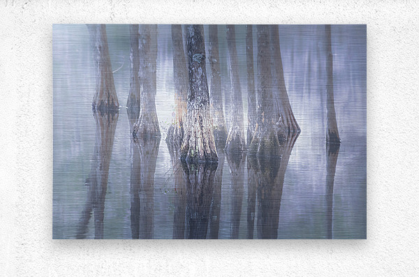 Bald Cypress Tree wetland woodland emerges from a still, reflective pond in South Carolina's low county. Located between Charleston and McClellanville near Awendaw, a soft, hazy, and blue-tinted, atmosphere gives the nature preserve an ethereal quality. Lit by low winter light, the muted glow transforms the serene scenery into an almost abstract landscape.