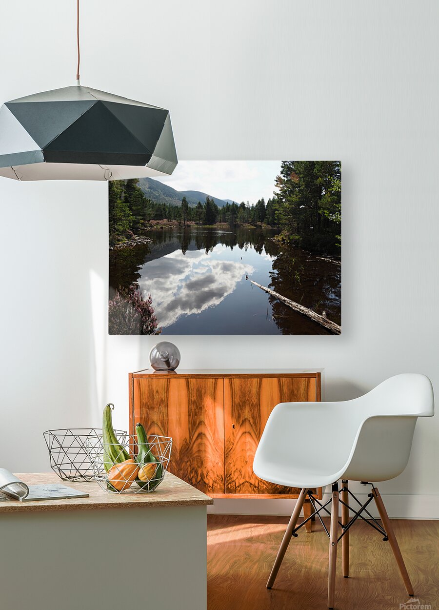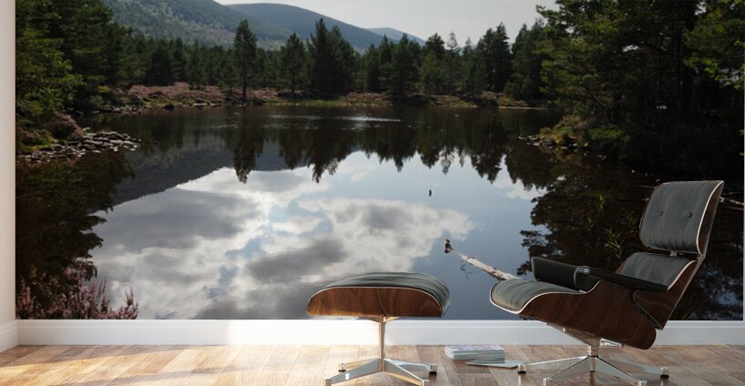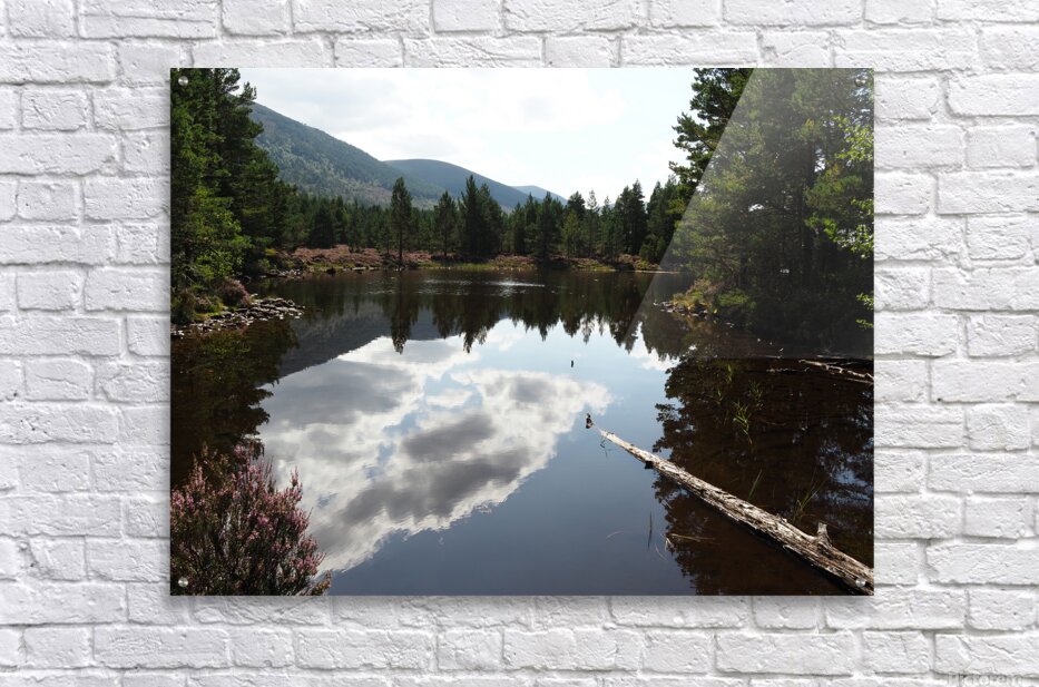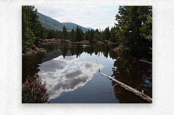 I took this photo during a lovely summer nature walk through the Scottish Highlands. Features a tranquil loch reflecting fluffy clouds against a backdrop of dense Pine forest and distant hills. The calm water creates a mirror effect, highlighting the vivid greenery of the trees surrounding the lake. A fallen log in the foreground adds a natural, rustic element to the serene landscape.