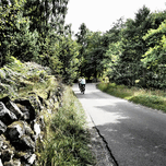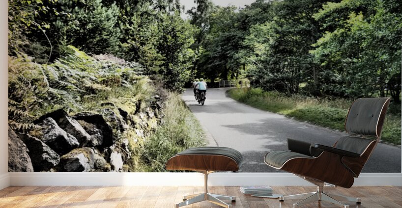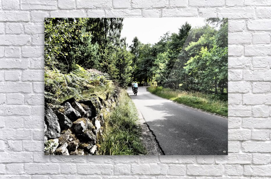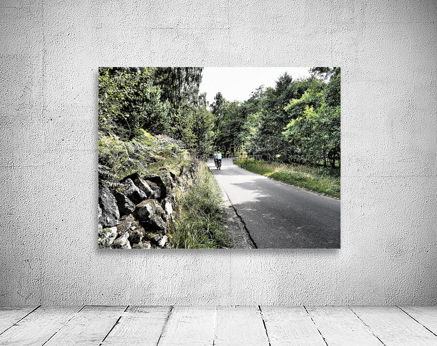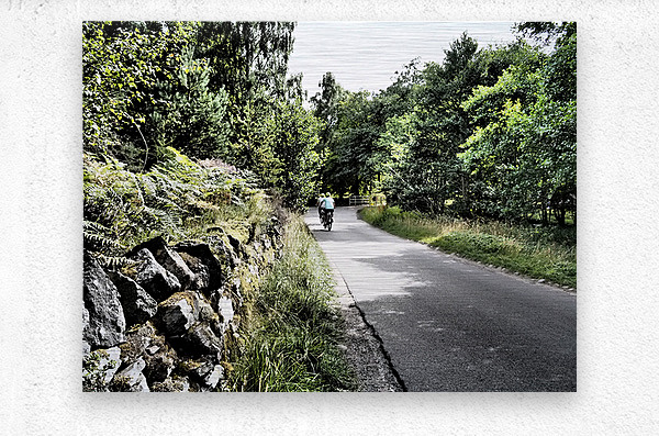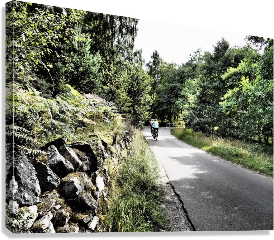I took this photo during a lovely summer nature walk through the Scottish Highlands. Features two cyclists riding along a quiet, winding road lined wi...[+]