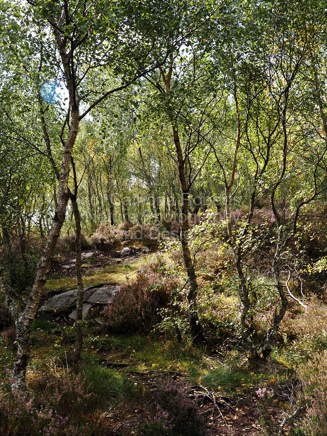I took this photo during a lovely summer nature walk through the Scottish Highlands. Features a peaceful, sun-dappled Birch forest revealing a winding trail through slender trees and lush, green foliage. The interplay of sunlight and shadows creates a serene ambiance, inviting viewers to imagine exploring the tranquil surroundings. Delicate hues of purple Heather and brown wildflowers add a touch of color to the forest floor.