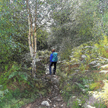 I took this photo during a lovely summer nature walk through the Scottish Highlands. Features a lone hiker navigating a narrow trail surrounded by dense, green foliage. Tall birch trees and vibrant ferns create a serene, natural setting that invites exploration and adventure. The play of light and shadow adds depth to the scene, highlighting the tranquility of the forest.