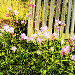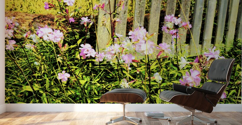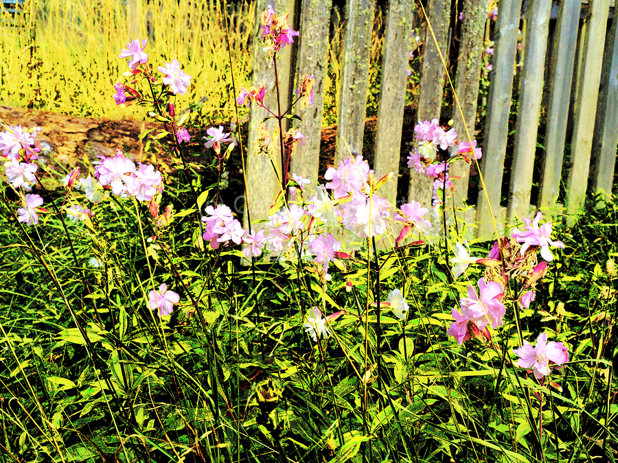 I took this photo during a lovely summer nature walk through the Scottish Highlands, laterally digitally colour edited. Features delicate pink flowers blooming vibrantly in the foreground, juxtaposed against a weathered wooden fence. The sunlight casts a warm glow on the scene, highlighting the contrast between the lively flowers and the rustic backdrop. Nature's beauty is captured in a serene and enchanting setting.