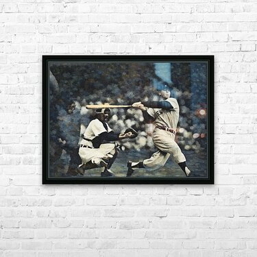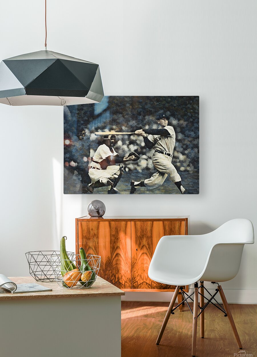 Baseball icon Mickey Mantle takes a big swing in this Row One Brand mixed media painting created from authentic late 1950s art. This beautiful sports painting will look terrific in your home or office. Derivative art © 2025 Row One Brand