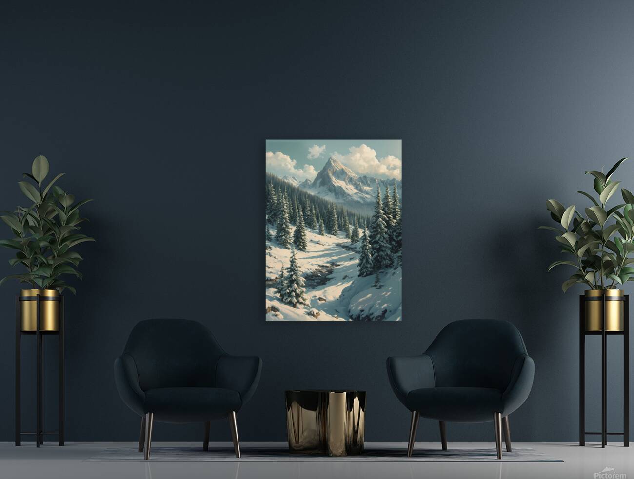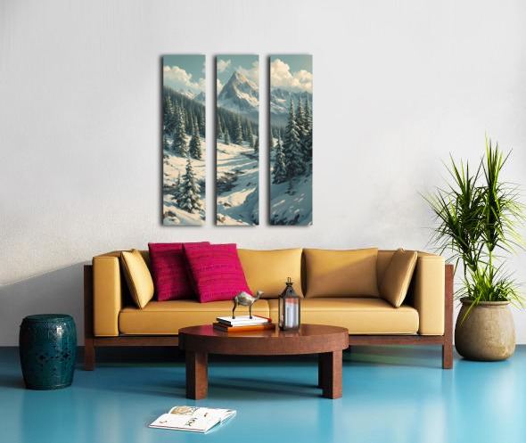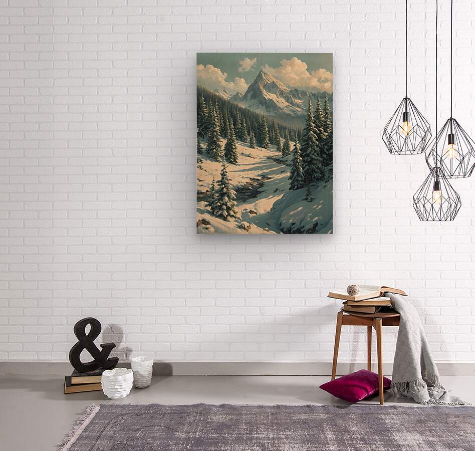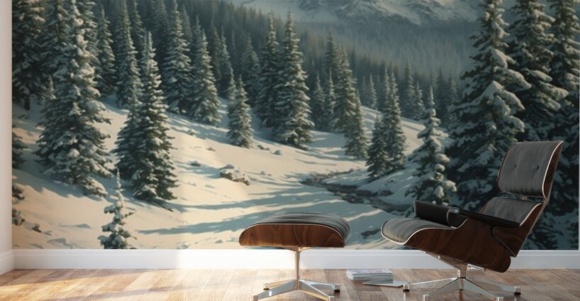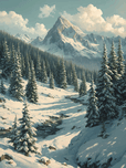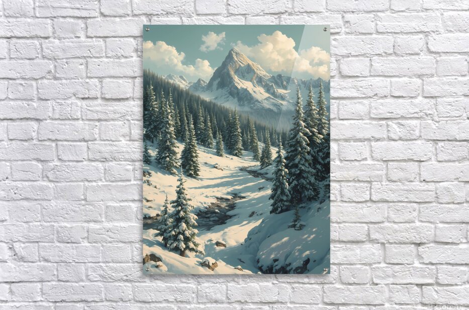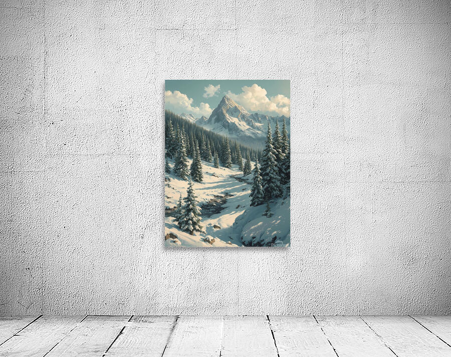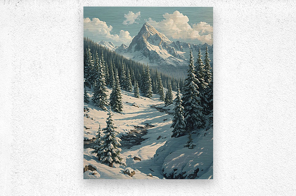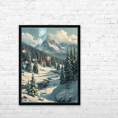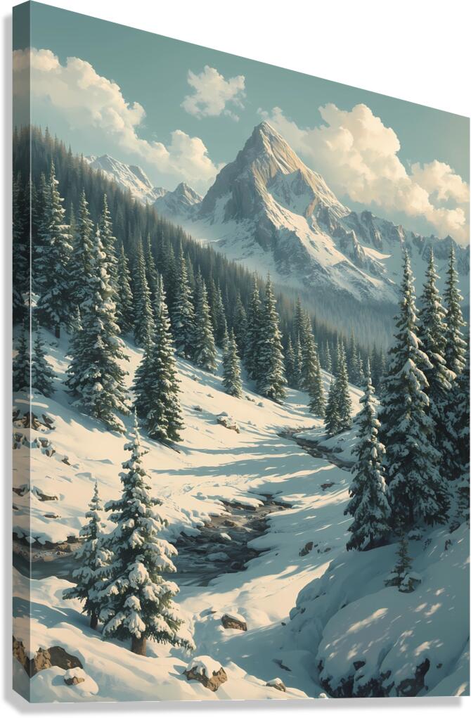 Bring the serenity of nature into your space with this stunning wall art featuring a breathtaking snow-covered mountain range. Towering evergreens dusted with fresh snow frame a peaceful valley where a gentle stream winds its way through the landscape. Bathed in soft daylight beneath drifting clouds, this artwork captures the stillness and grandeur of winter in the mountains. Perfect for adding a touch of tranquility and natural beauty to your living room, bedroom, office, or cabin décor.