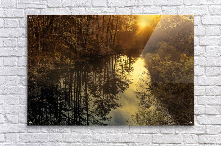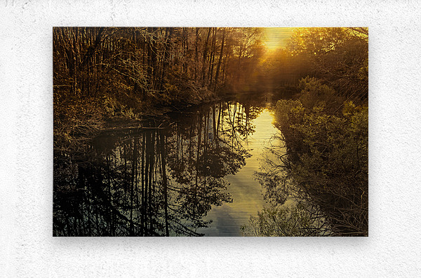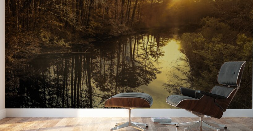 The Francis Marion National Forest is full of tranquil rivers meandering through scenic dense forest rivers, reflecting skeleton-like trees lining its banks in winter. The setting sun casts a golden glow over the scene, illuminating the lush foliage and creating a serene, otherworldly atmosphere. The composition captures the stillness of nature and the interplay of light and shadow. Located north of Charleston between Awendaw and McClellanville, south of Georgetown.