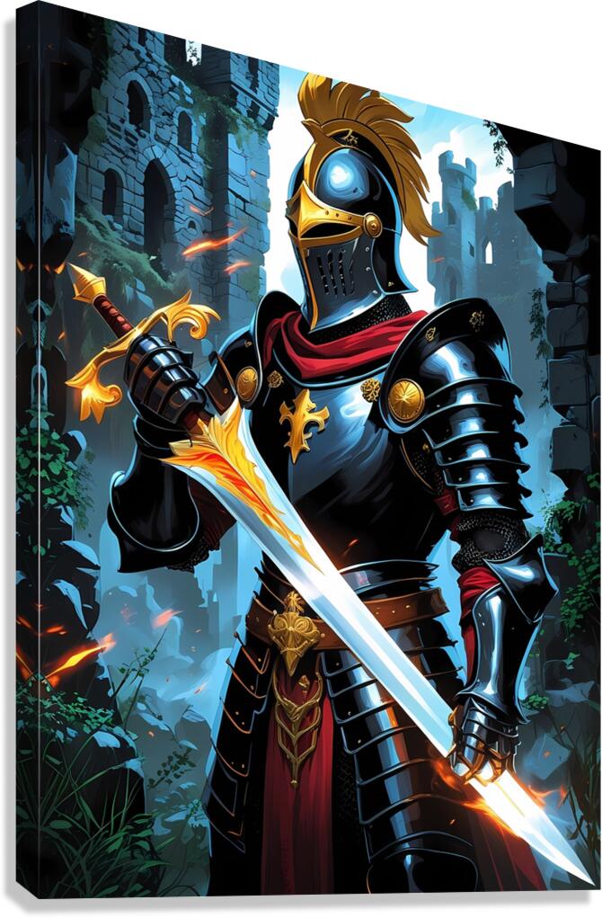 A powerful medieval knight clad in black and gold armor, holding a glowing flaming sword in front of ancient castle ruins. This fantasy artwork captures strength, honor, and mystery, making it a perfect wall art piece for fans of epic battles, medieval legends, and fantasy games. Ideal for home décor, gaming rooms, or collectors of heroic artwork.