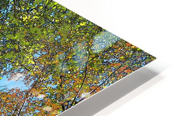 I took this photo using a creative photographic filter, during a lovely autumnal nature walk through the Scottish Highlands. Features a vivid scene of a Birch forest canopy displaying various shades of green and yellow leaves interspersed with vibrant autumnal colors. The sky, a clear, bright blue, serves as a striking backdrop, contrasting with the rich foliage. Sunlight filters through the leaves, creating a lively and dynamic ambiance.