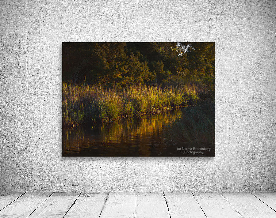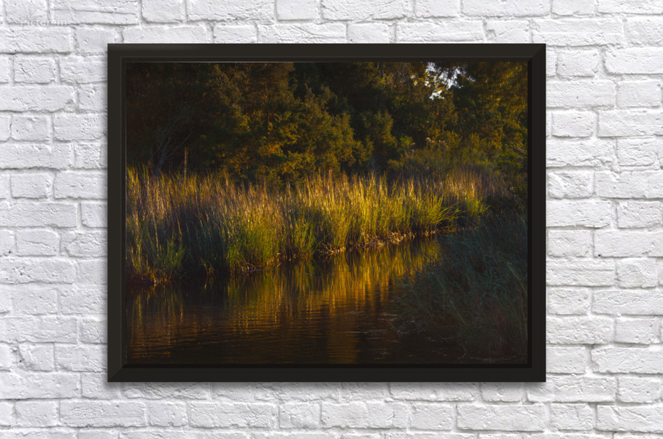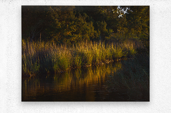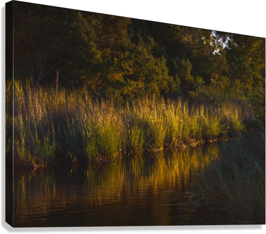 Moody, atmospheric wetland streams meander through the South Carolina Francis Marion National Forest. The reeds, grasses and calm tidal ACE water basin are gently illuminated by the low afternoon golden hour beams of light, just before sunset. Bring a book, an outdoor chair and be lulled to sleep by a serene atmosphere of frogs and insects singing their songs, the grasses, rustling tree leaves and soft breezes adding to the symphony of music conducted by Mother Nature.