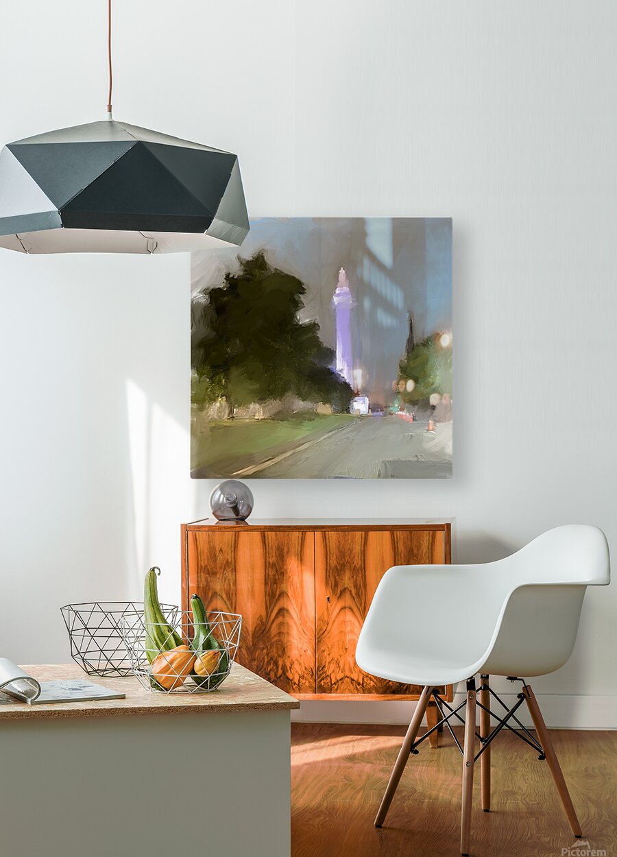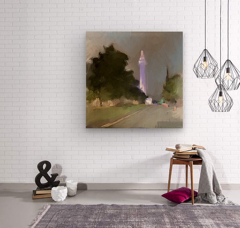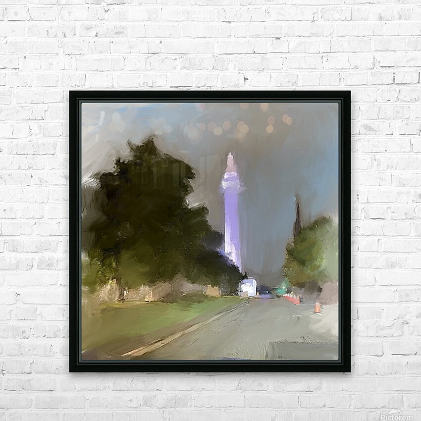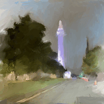 I captured a photo while driving through the city. I decided to use it as inspiration for a painting.-the dark green trees on either side naturally guide the gaze toward the illuminated monument, providing a strong sense of depth and perspective. The contrast between the muted landscape and the highlighted tower adds drama and significance to the architectural subject, showing reverence or nostalgia, echoing my personal experience in that moment. The hazy, almost ethereal effect is achieved through the lack of sharp details further enhances this mood, encouraging you to recall your own nighttime journeys or the quiet majesty of city landmarks after dark.