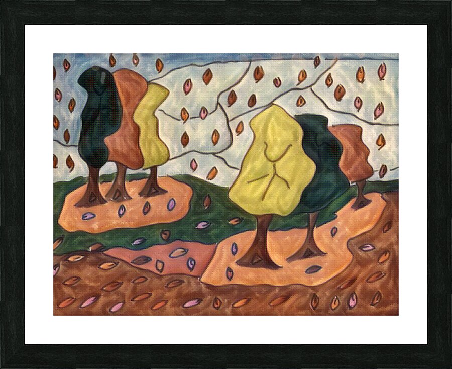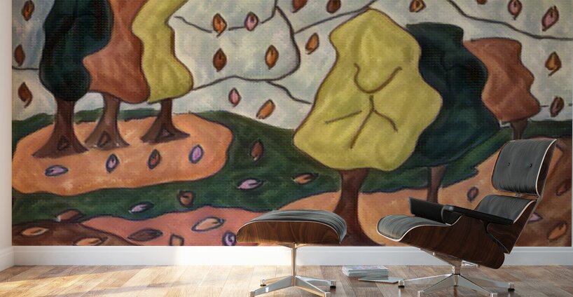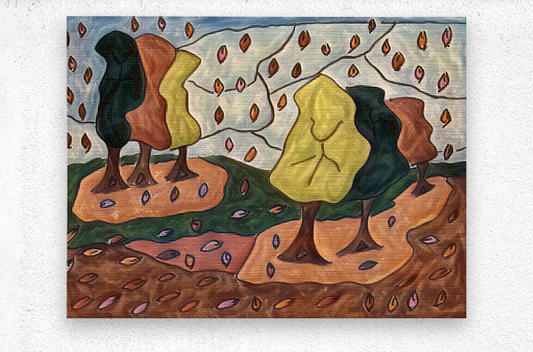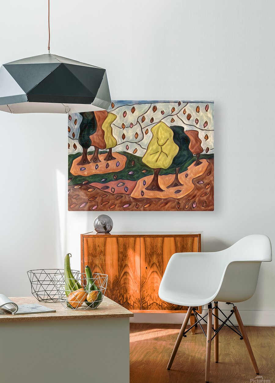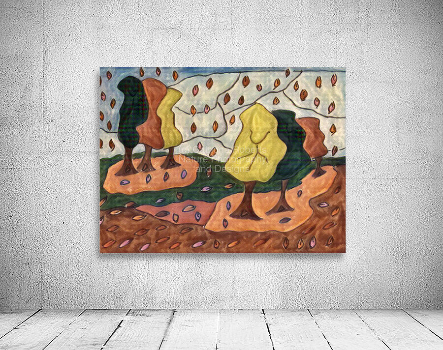 I originally hand drew this work from imagination using coloured ink pens and paper, laterally digitally manipulating it (using a creative filter in canva.com) to enable this modern abstract design to emerge. Features a stylized forest with abstract trees and colorful leaves falling across the landscape. The leaves create vibrant patterns against the earthy tones.