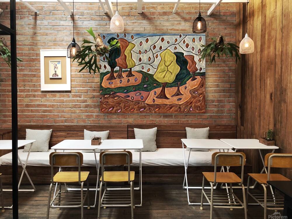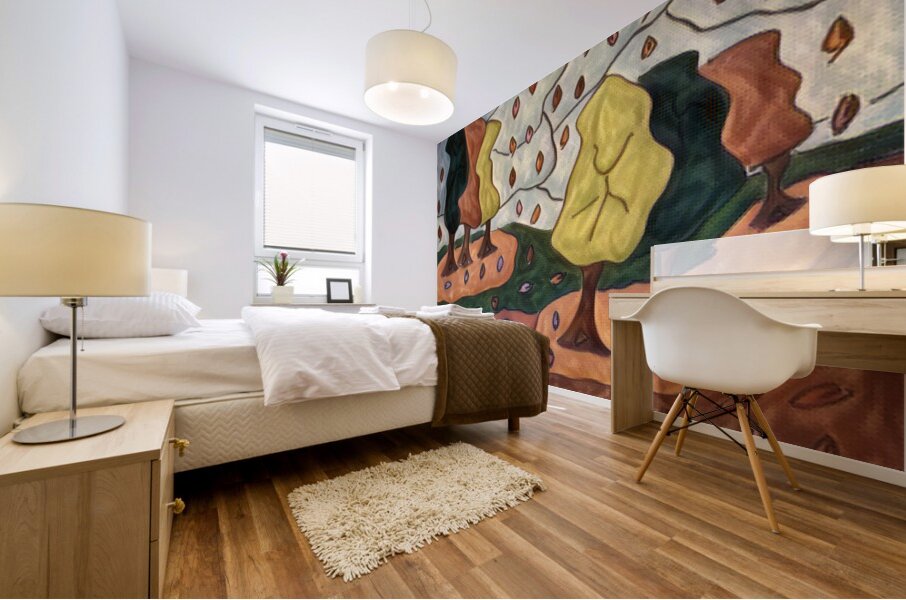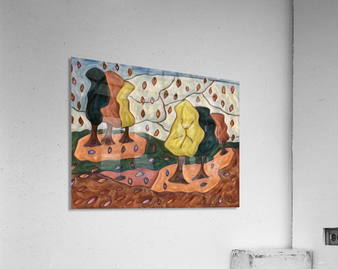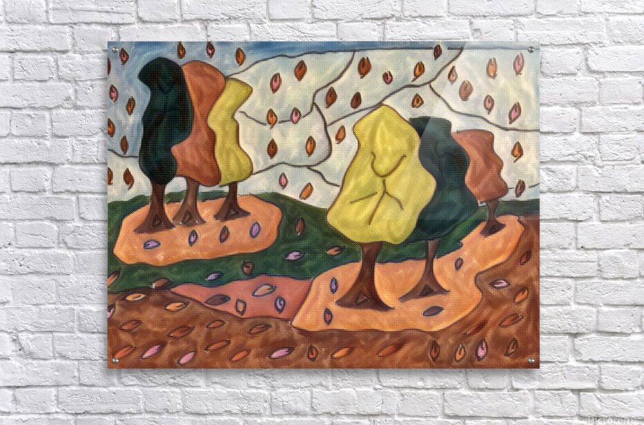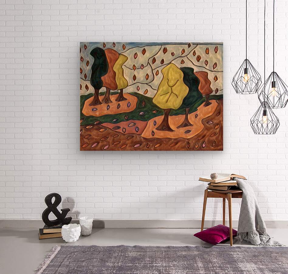 I originally hand drew this work from imagination using coloured ink pens and paper, laterally digitally manipulating it (using a creative filter in canva.com) to enable this modern abstract design to emerge. Features a stylized forest with abstract trees and colorful leaves falling across the landscape. The leaves create vibrant patterns against the earthy tones.