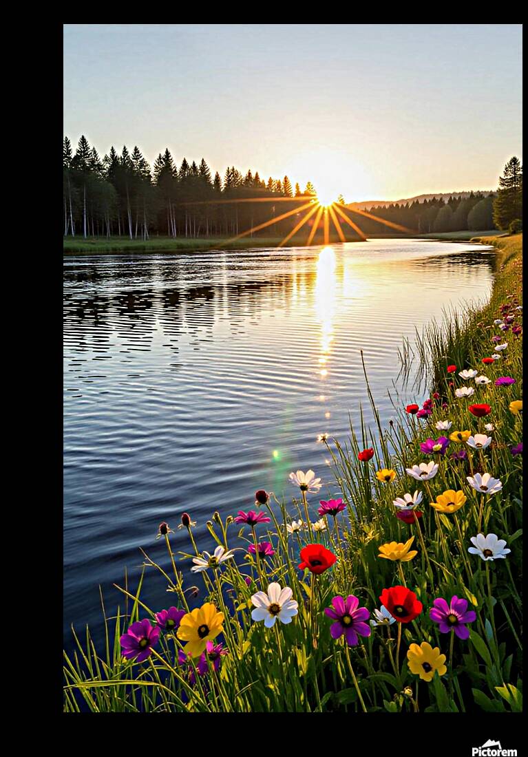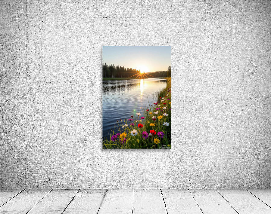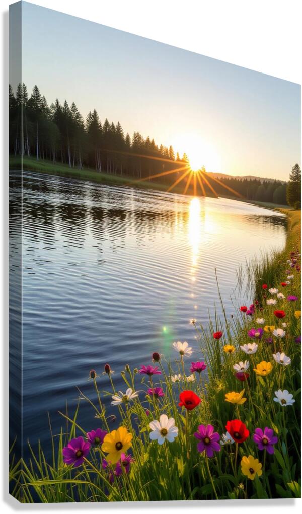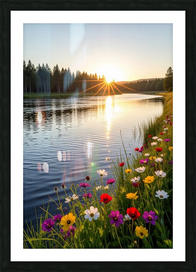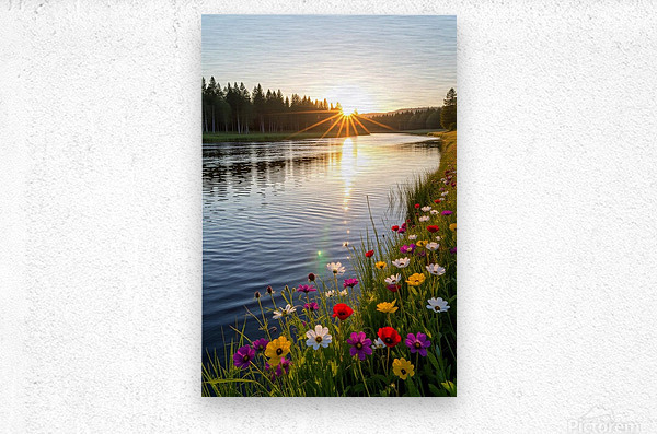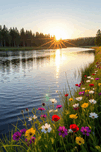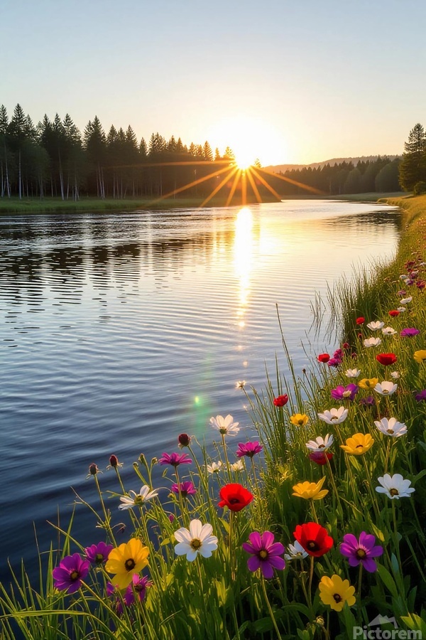 A breathtaking photograph captures a tranquil sunset over a winding river. The sun, a radiant golden orb, casts a brilliant reflection across the rippling water, creating a path of light that stretches toward the viewer. On the grassy riverbank in the foreground, a vibrant assortment of wildflowers in shades of red, purple, yellow, and white soars towards the fading light. A dense line of evergreen trees silhouettes the horizon, adding to the peaceful, secluded atmosphere of this natural masterpiece. This image evokes a feeling of calm and serene beauty, highlighting the simple yet stunning harmony of nature.