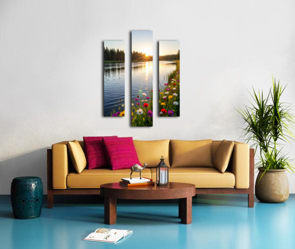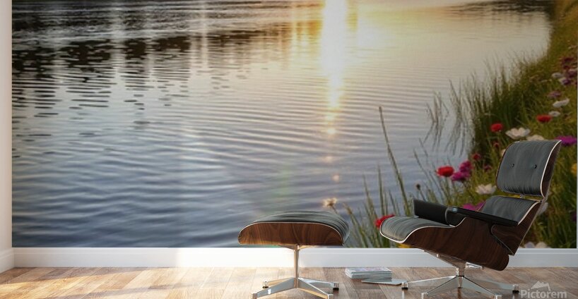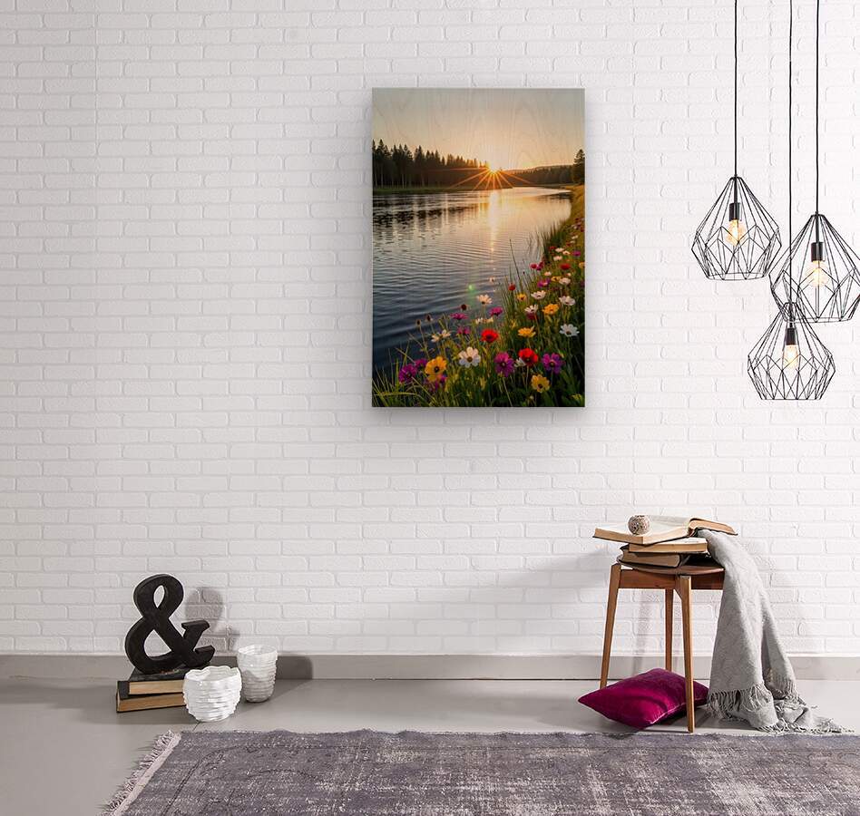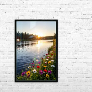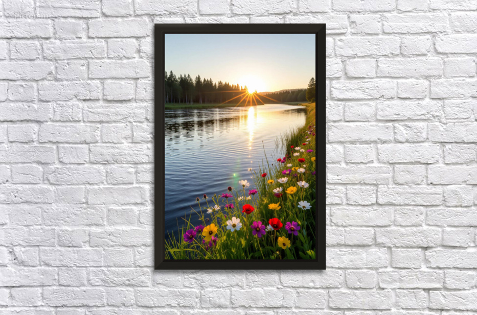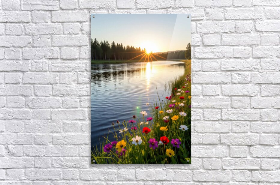A breathtaking photograph captures a tranquil sunset over a winding river. The sun, a radiant golden orb, casts a brilliant reflection across the rippling water, creating a path of light that stretches toward the viewer. On the grassy riverbank in the foreground, a vibrant assortment of wildflowers in shades of red, purple, yellow, and white soars towards the fading light. A dense line of evergreen trees silhouettes the horizon, adding to the peaceful, secluded atmosphere of this natural masterpiece. This image evokes a feeling of calm and serene beauty, highlighting the simple yet stunning harmony of nature.