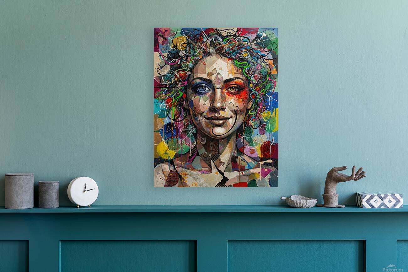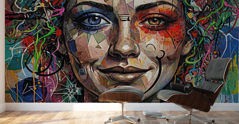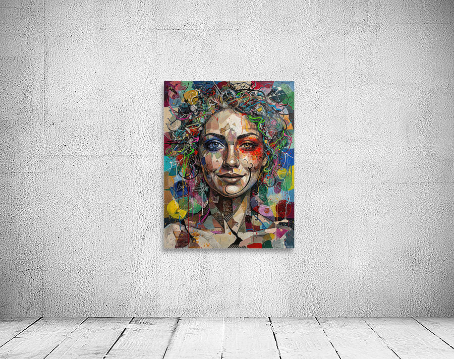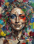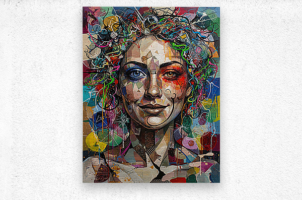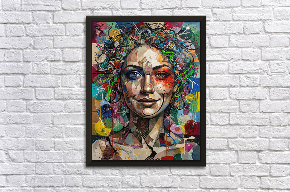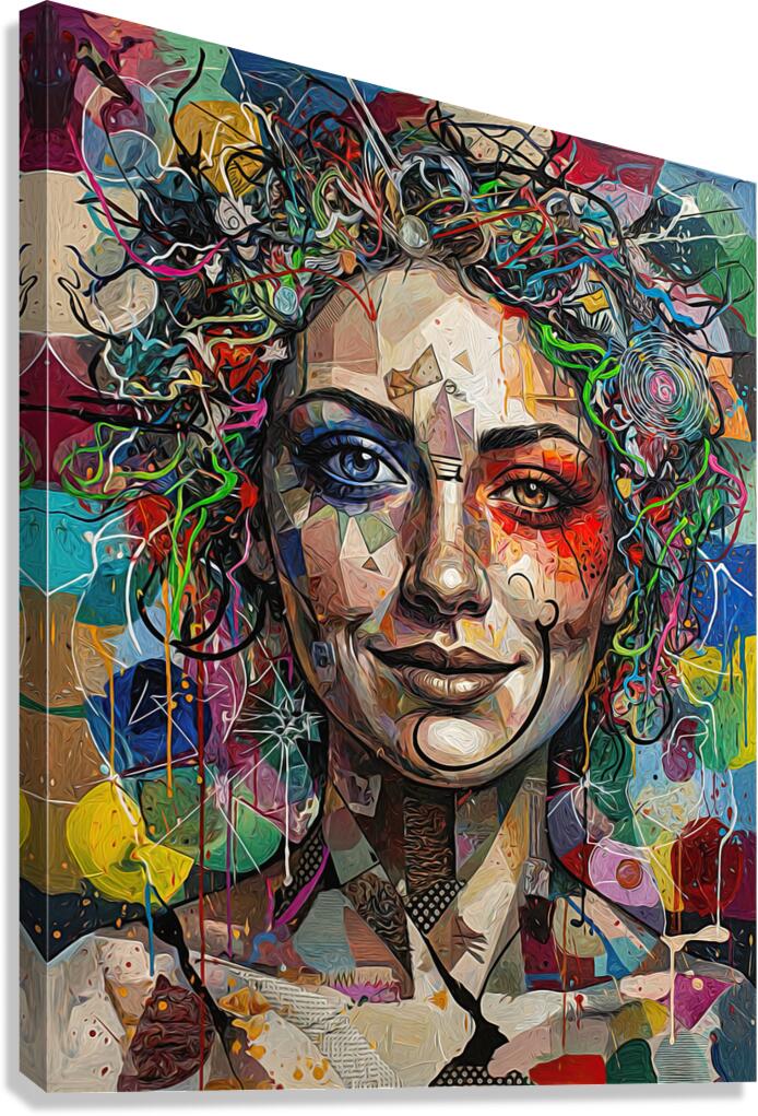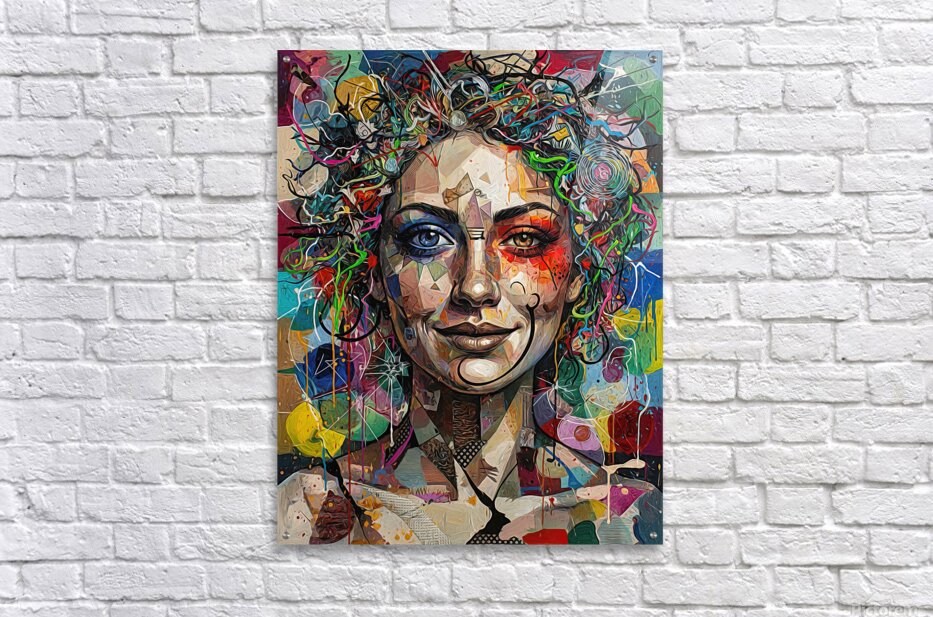 This mesmerizing oil portrait fuses cubism surrealism and abstract expression in a dazzling explosion of color and form. The womans serene smile is framed by vibrant swirling elements and intricate textures that evoke a sense of wonder and complexity. Her heterochromatic eyes and dreamlike hair blend organic motion with geometric fragments making this piece a bold and imaginative focal point for eclectic interiors and artistic collections.