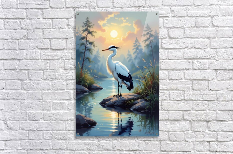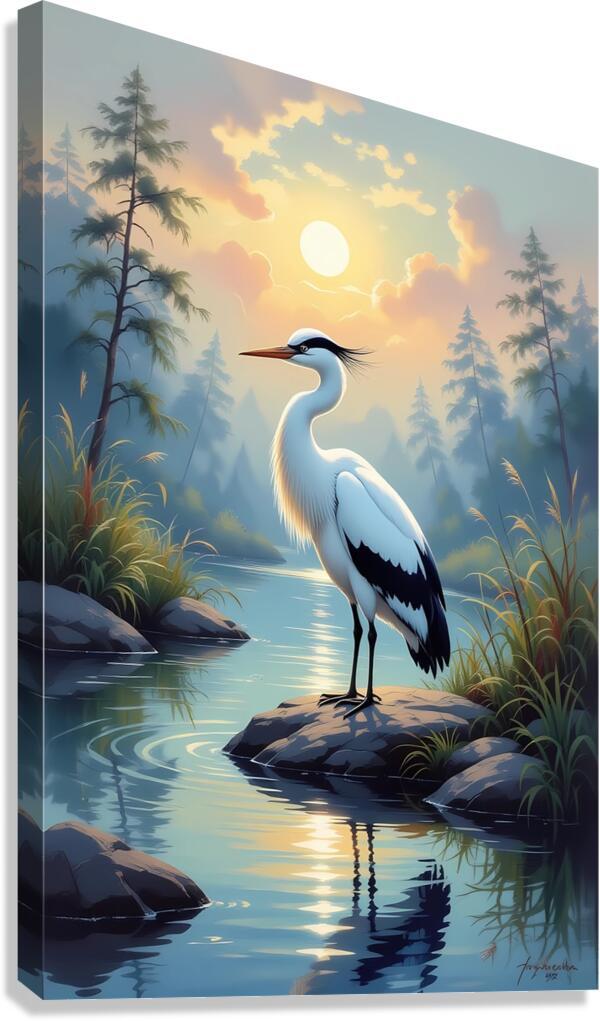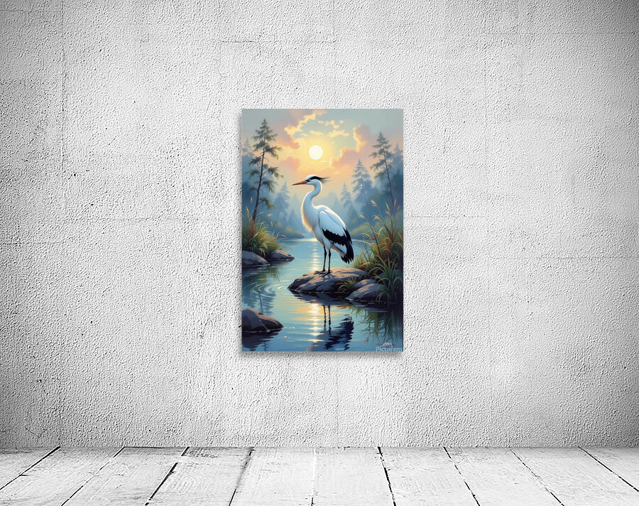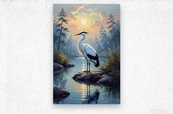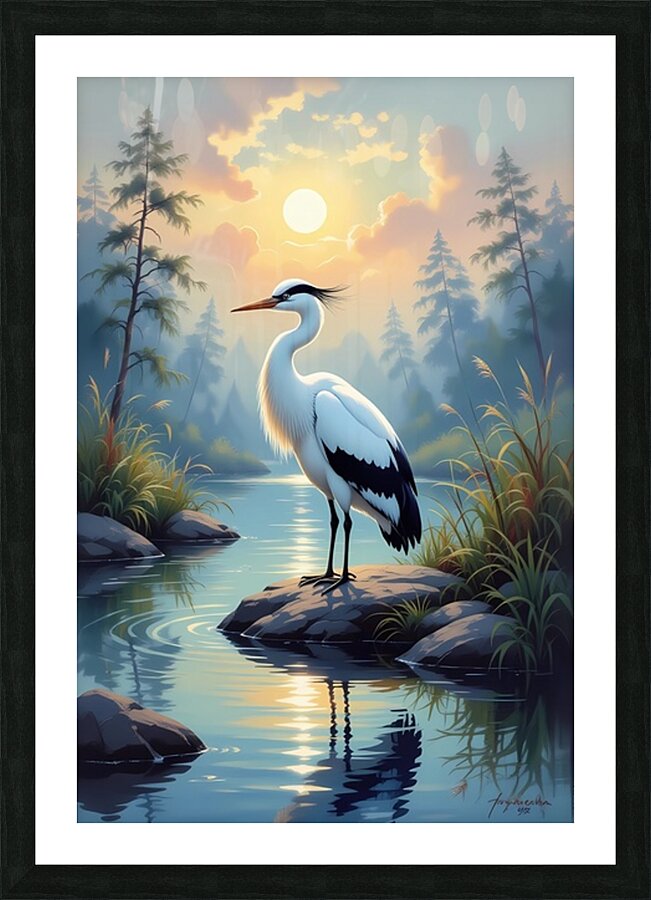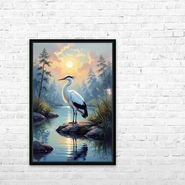 A graceful heron stands poised on a river rock as the first light of dawn bathes the forest in golden hues. The still waters reflect the bird’s elegance, while misty pines and a glowing sun create a dreamlike harmony between land, sky, and water. This artwork captures the quiet strength of nature, symbolizing patience, clarity, and the beauty of new beginnings.
