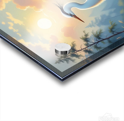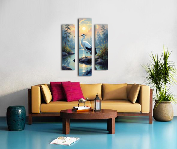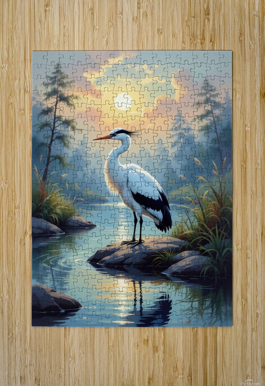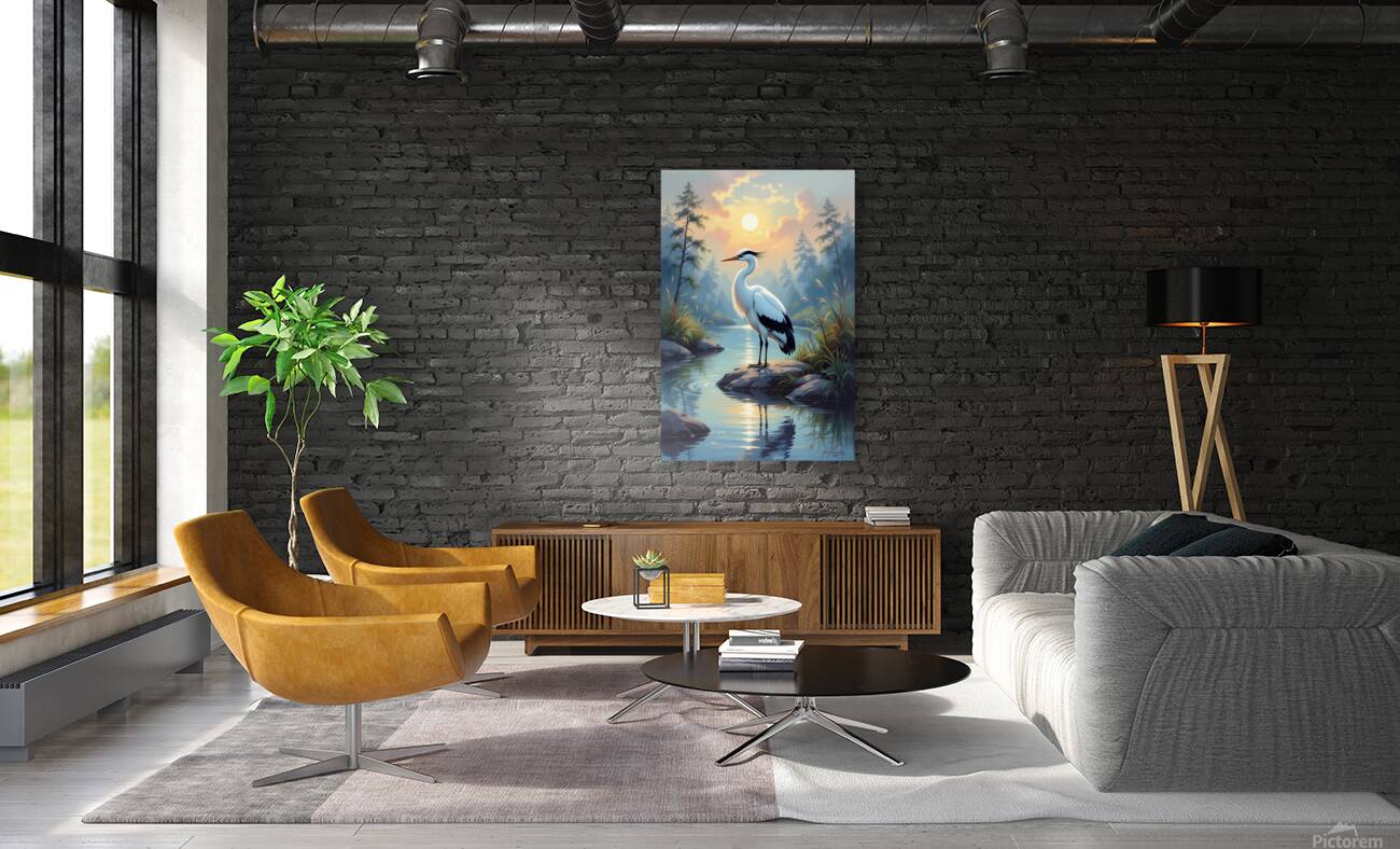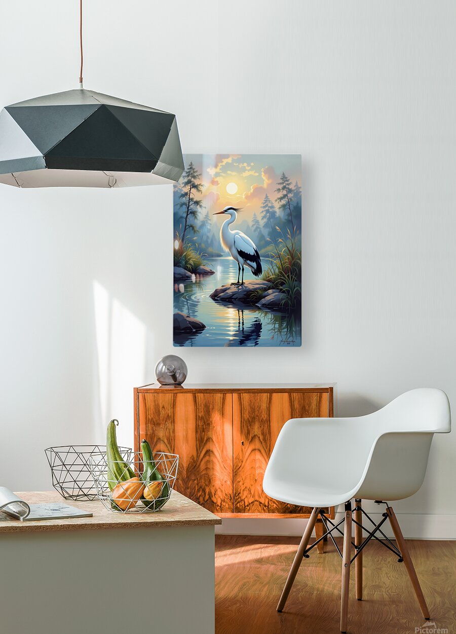 A graceful heron stands poised on a river rock as the first light of dawn bathes the forest in golden hues. The still waters reflect the bird’s elegance, while misty pines and a glowing sun create a dreamlike harmony between land, sky, and water. This artwork captures the quiet strength of nature, symbolizing patience, clarity, and the beauty of new beginnings.