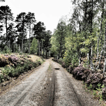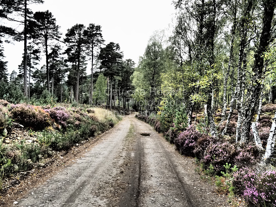 I took this photo during a lovely early autumnal nature walk through the Scottish Highlands. Features a narrow dirt path cutting through a serene forest lined with Birch and Pine trees. Purple heather adds color to the landscape.