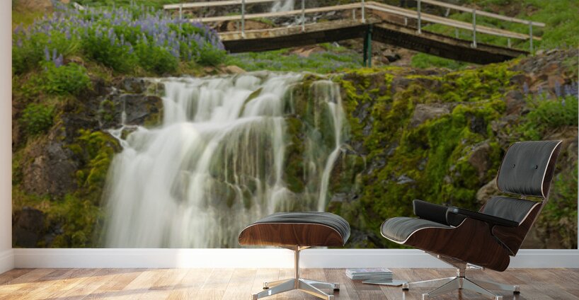 Budareyrarfoss waterfall cascades down the mountain by the port of Seydisfjordur in Iceland surrounded by lupines