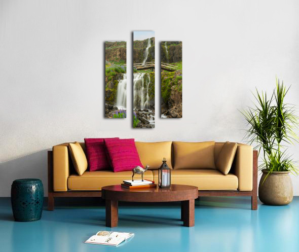 Budareyrarfoss waterfall cascades down the mountain by the port  Canvas print