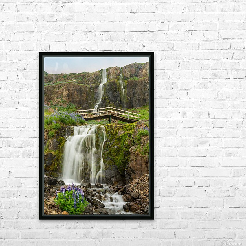Get this artwork "Budareyrarfoss waterfall cascades down the mountain by the port " in a framed print.