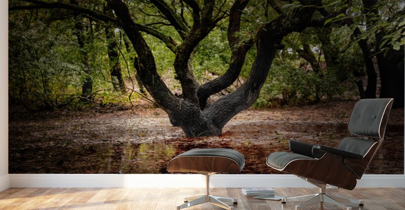 A strikingly twisted tree stands in a serene forest in First Landing State Park, Virginia Beach, Chesapeake Bay, waterfront, wetland location, surrounded by the glow of fallen leaves in the water. Sunlight filters gently through the foliage, highlighting the tree's intricate branches.