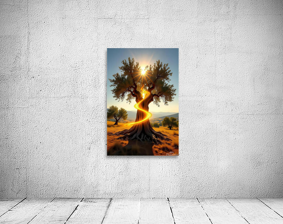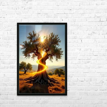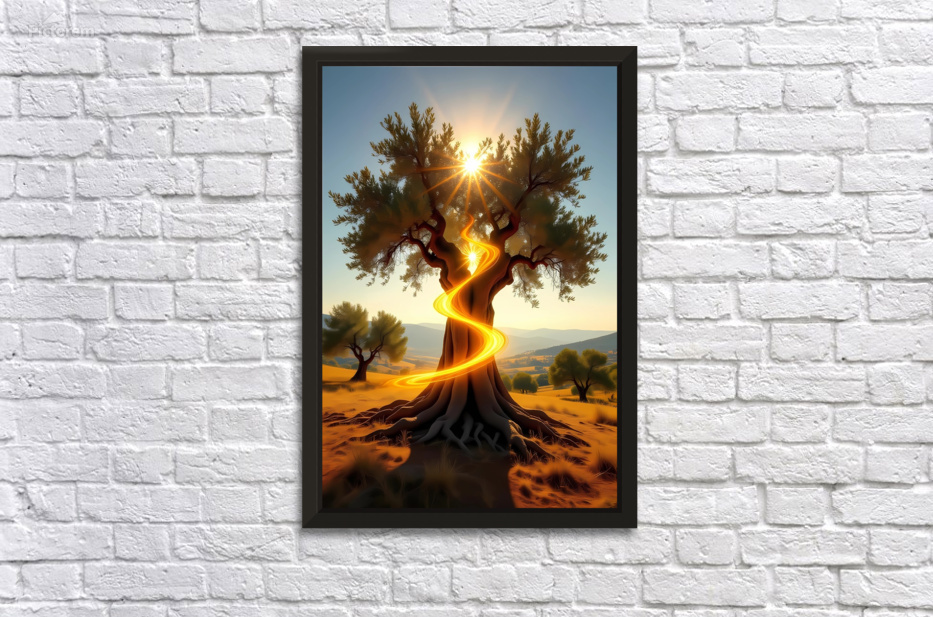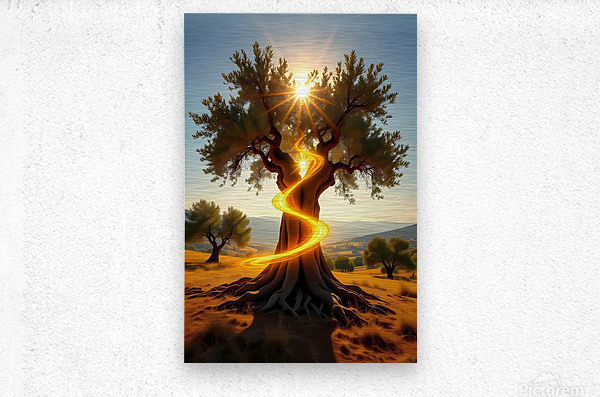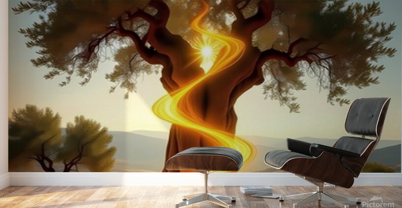 A captivating image featuring a majestic tree with a glowing golden spiral of light weaving through its trunk and branches, set against a serene sunse...[+]