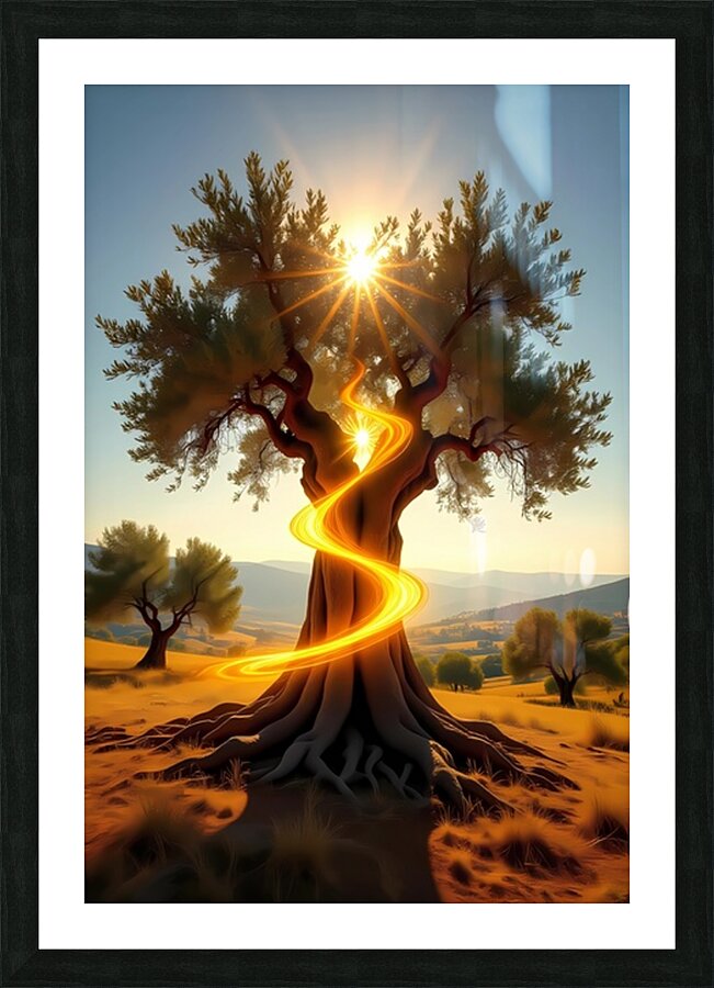 A captivating image featuring a majestic tree with a glowing golden spiral of light weaving through its trunk and branches, set against a serene sunset landscape with rolling hills and scattered trees. The warm hues and mystical aura evoke a sense of vitality and enchantment in nature.