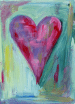 Abstract Purple Heart is a colourful abstract acrylic painting in portrait format painted by artist Karen Kaspar. A heart shape in vivid shades of purple, pink and red dances on a blue and green background. 389